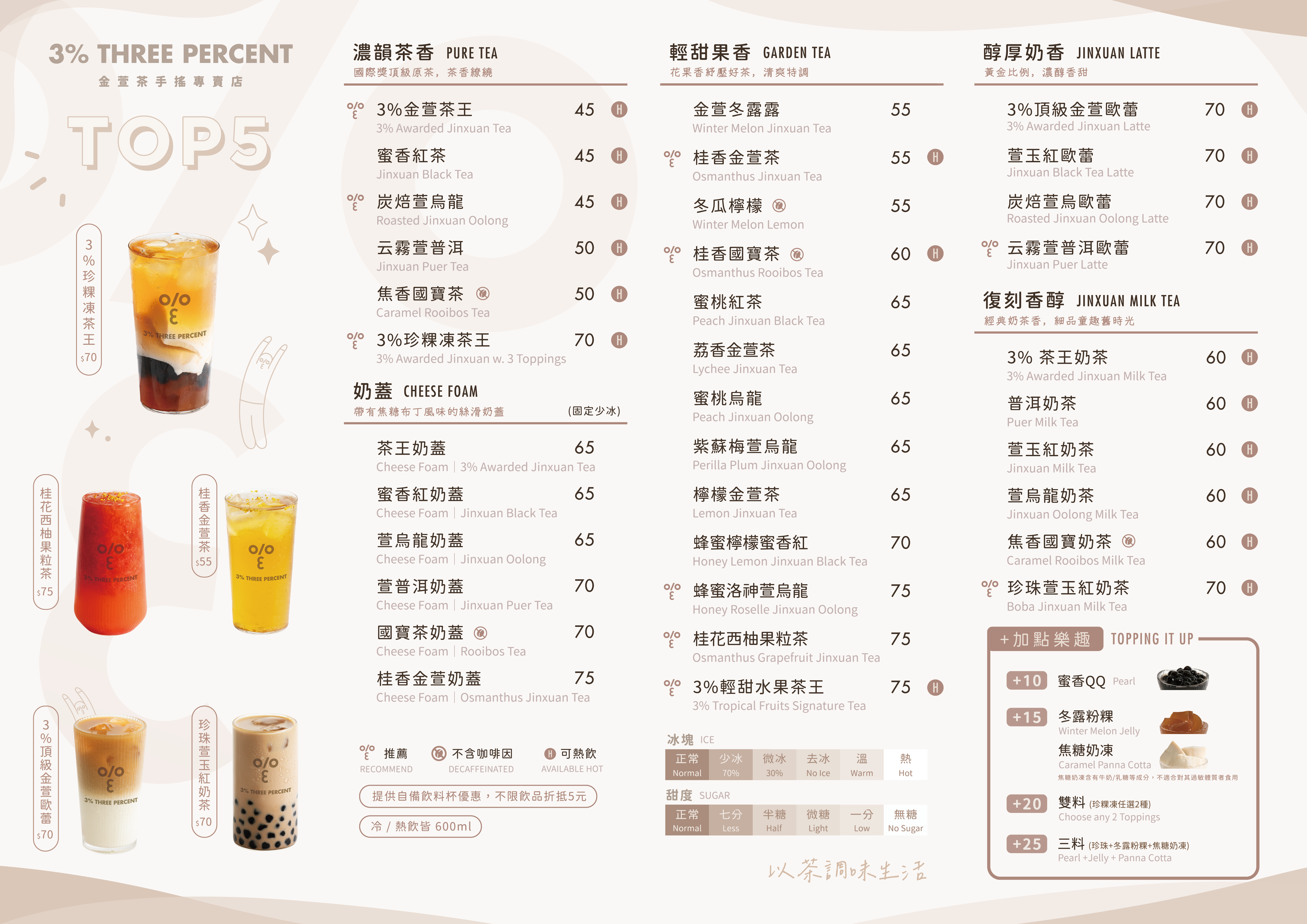 《3% Three Percent 金萱茶手搖專賣店》菜單如下