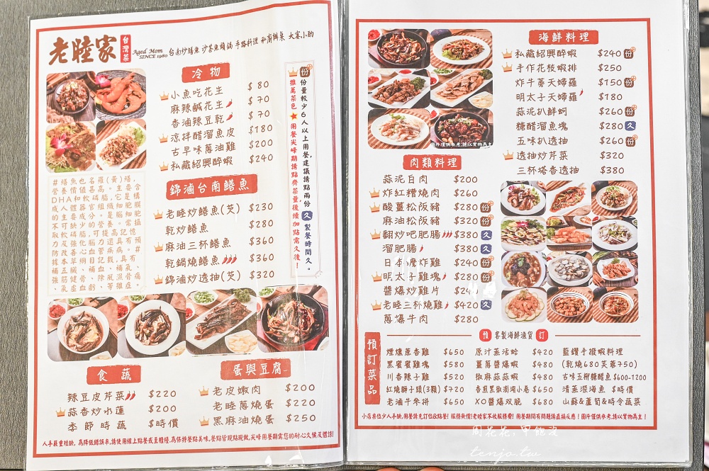 《老睦家台菜》菜單如下,這是常態供應的菜色