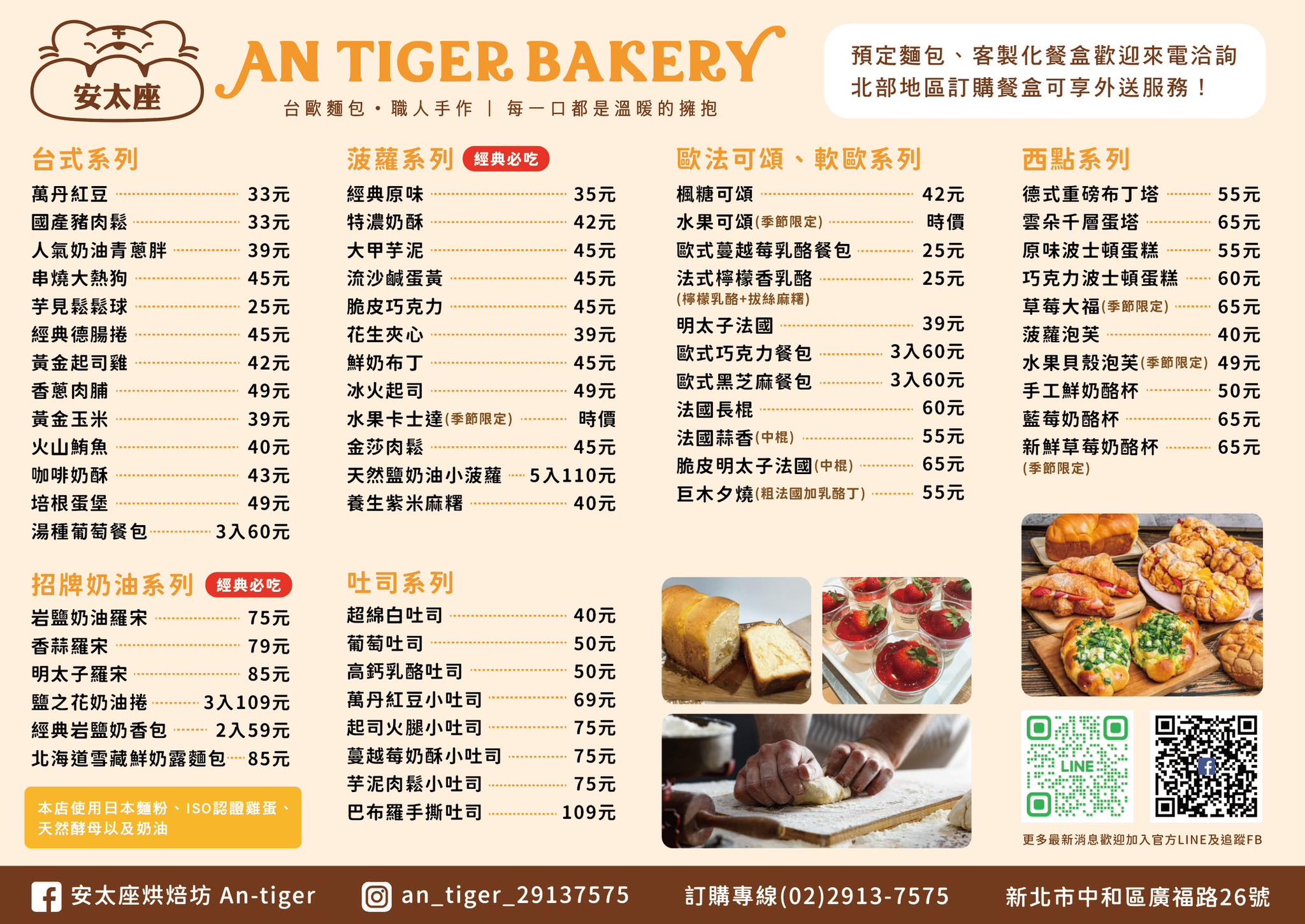 《安太座烘焙坊》菜單如下,手打各式職人手作的台歐麵包