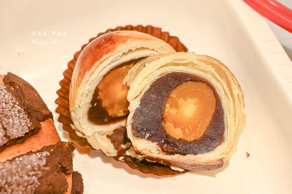 使用紐西蘭天然無水奶油、整顆紅土鴨蛋黃,搭配低糖烏豆沙餡,吃起來毫不甜膩