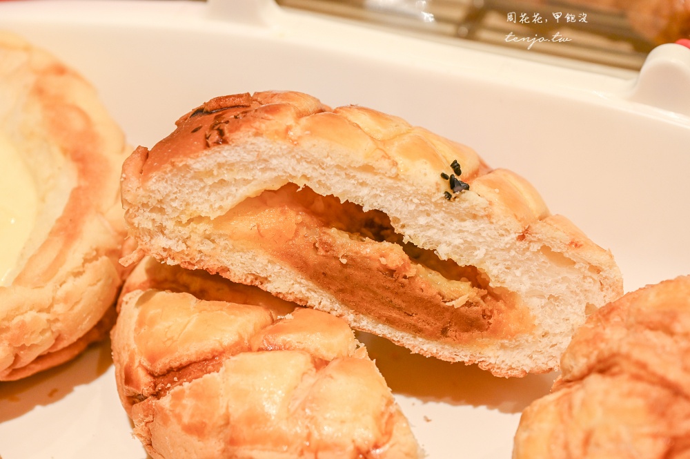 流沙鹹蛋黃內餡讓菠蘿麵包吃起來,又有點像是奶皇流沙包的感覺