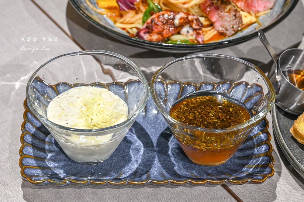 沙拉有義式油醋醬、經典羅馬凱薩醬二選一