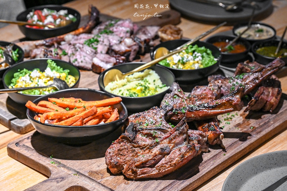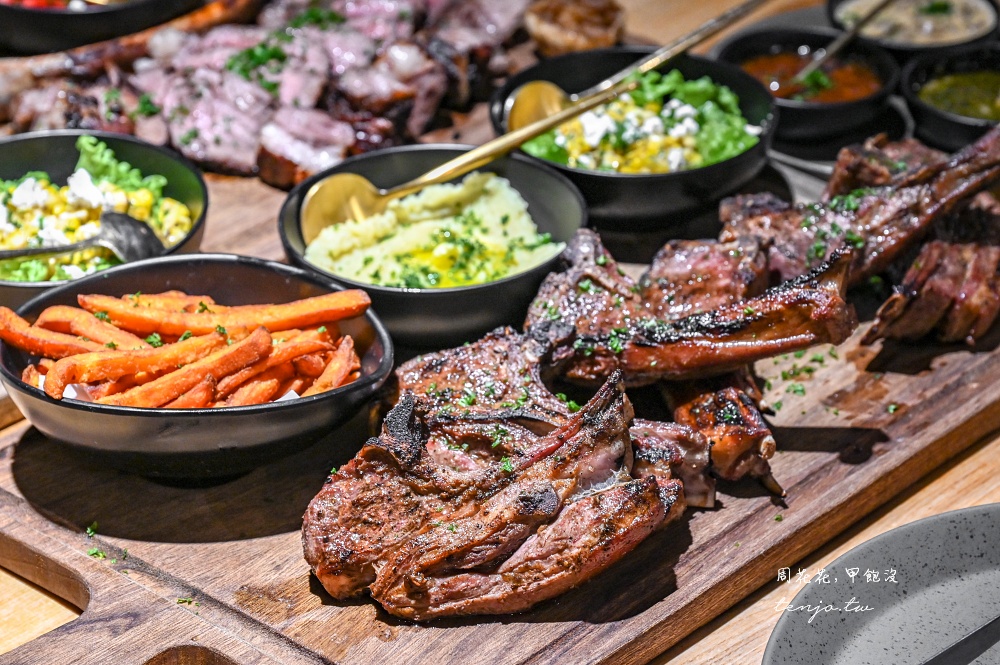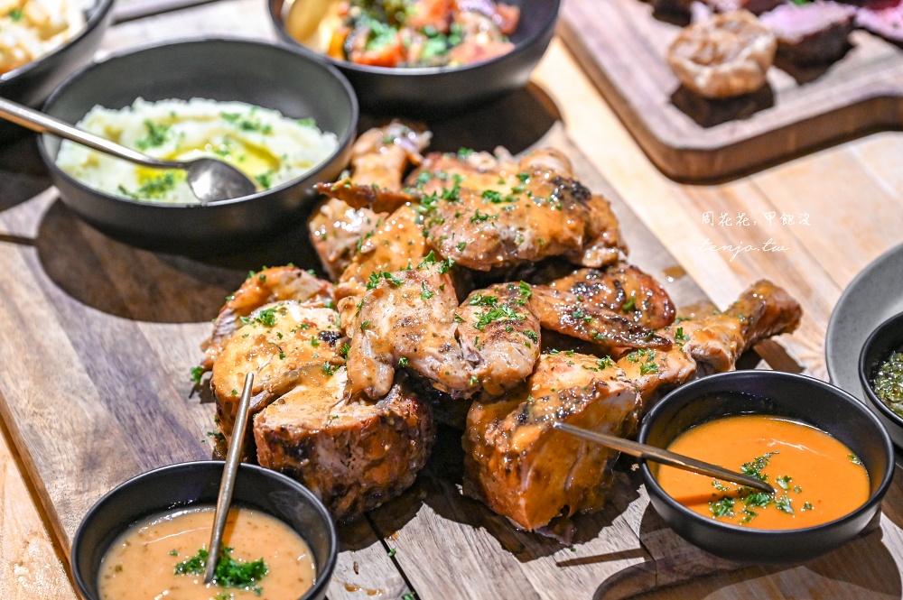 大份量烤肉擺好擺滿,搭配多樣化的醬汁、配菜,色香味俱全的出餐,看起來就超級好吃