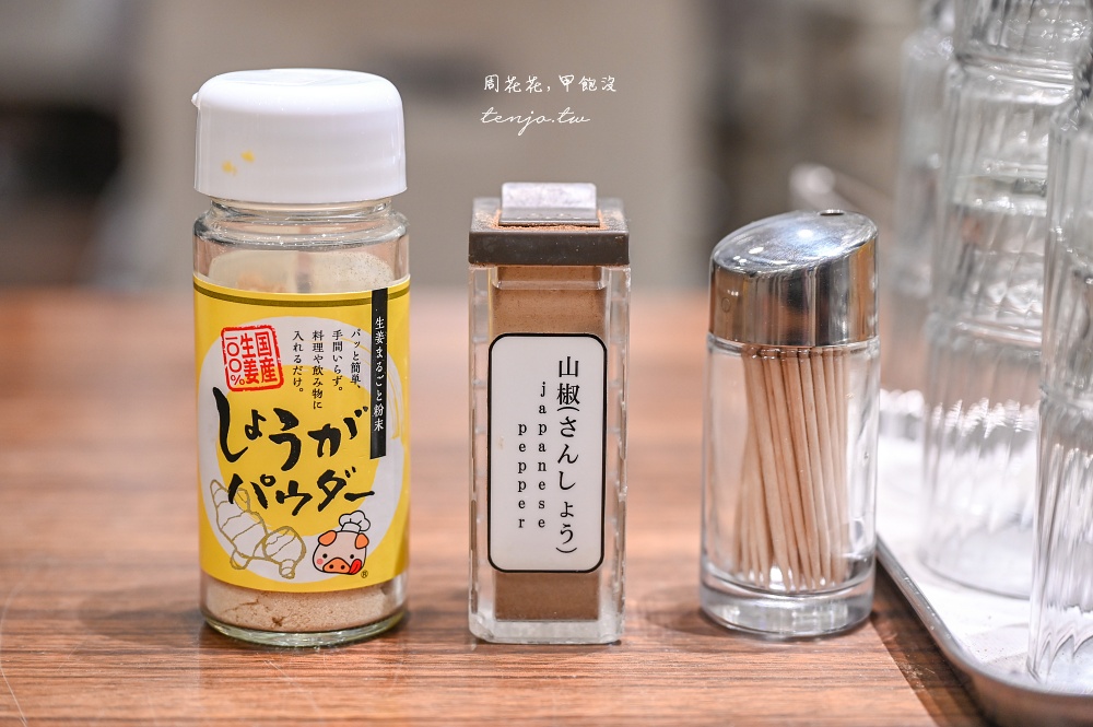 桌上擺有調味料山椒粉、生薑粉,強烈建議一定要加一點試試