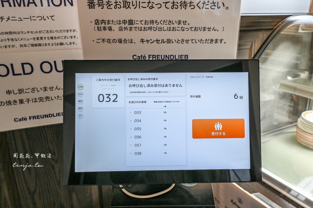 建議大家一抵達就先來《Cafe FREUNDLIEB》抽號碼牌,如果客滿要候位的話,再去一樓賣店逛逛、買買伴手禮,像我這天平日下午來,前面居然還有6組候位呢