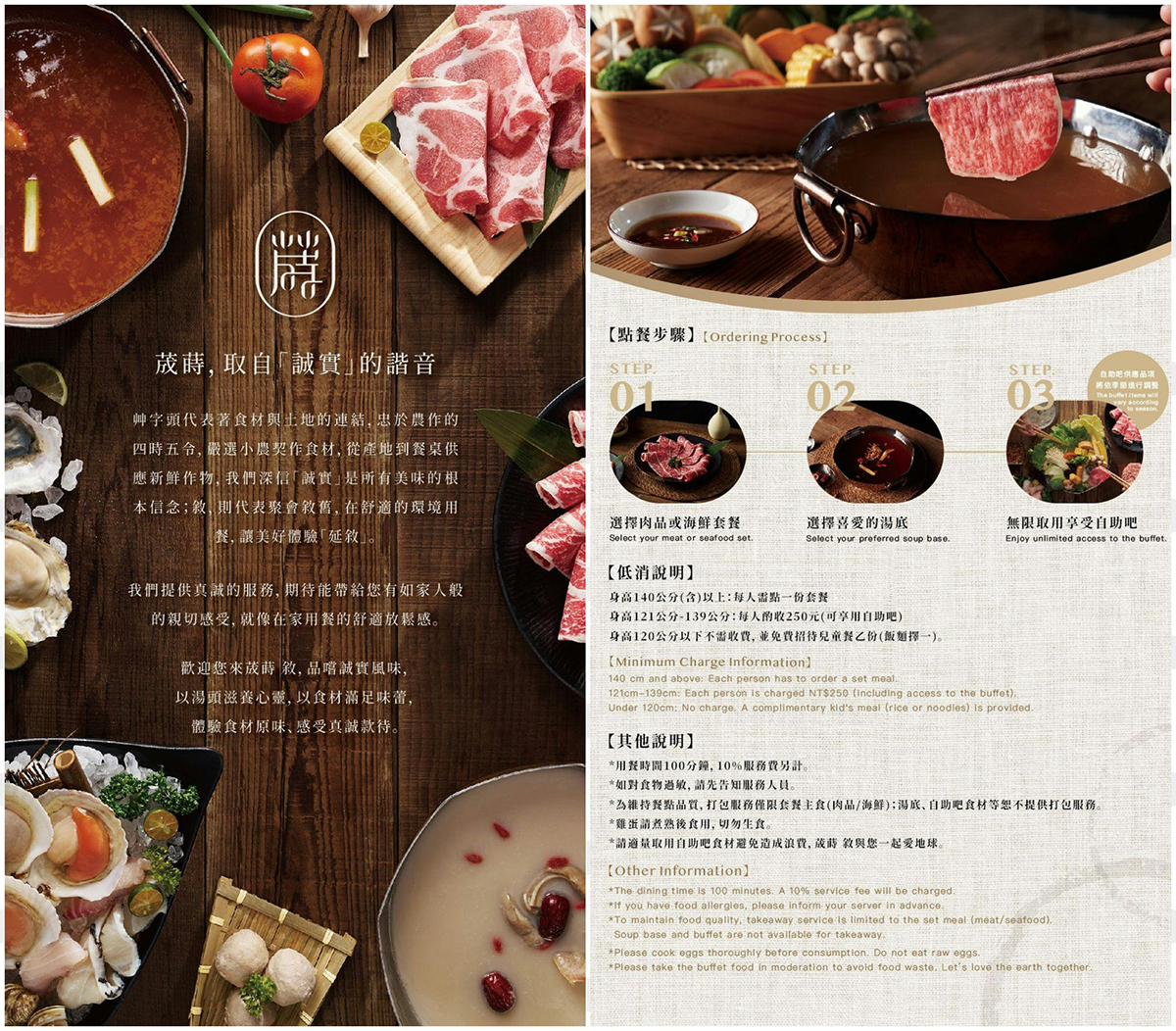 《荿蒔 敘鍋物》菜單如下,menu價格需加收10%服務費,成人低消一份套餐