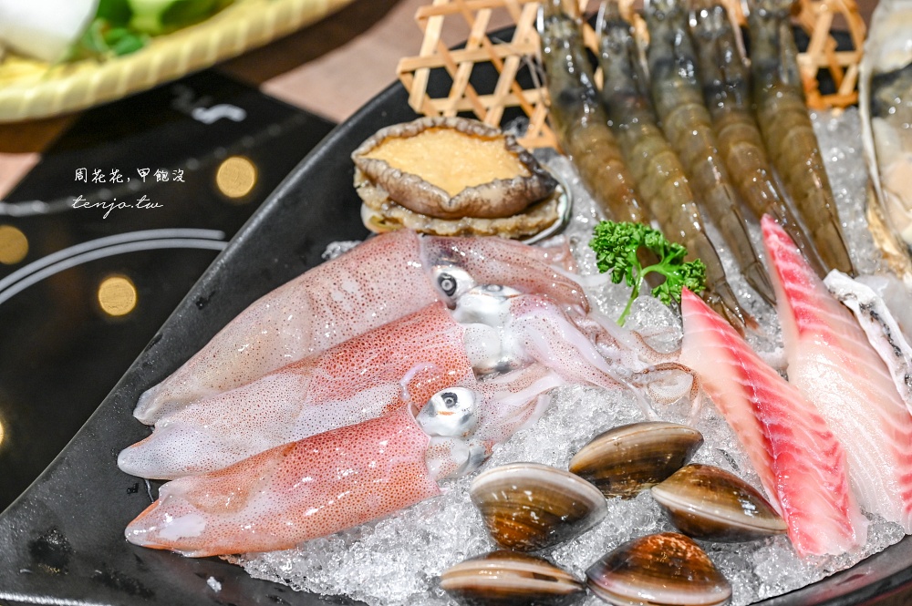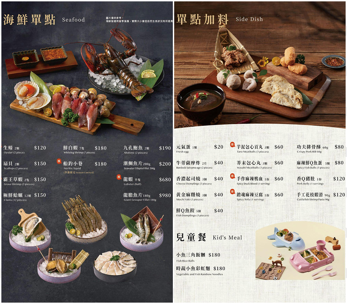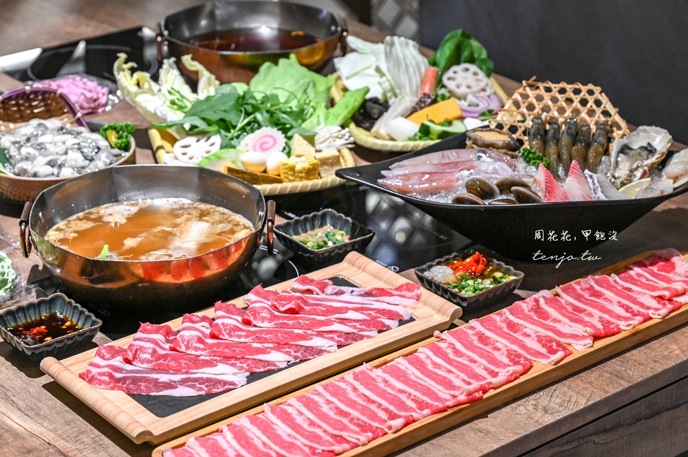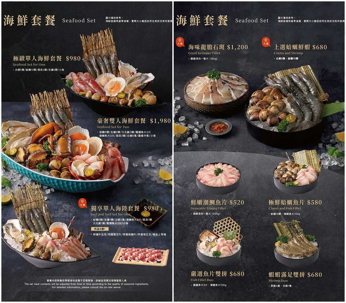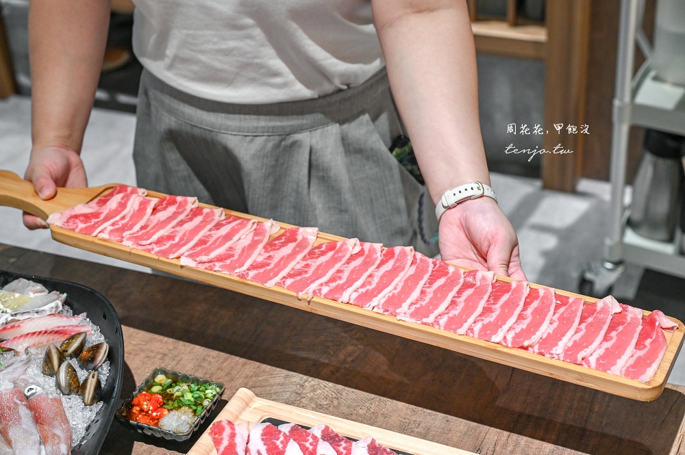 湯底共有九種選擇,基本款日式柴魚、蔬食養生昆布不用加價,如果有其他想吃的湯底,再做加價升級即可;主餐的肉品、海鮮品項相當豐富,無論你今天想吃哪一種都能有相對應的選擇