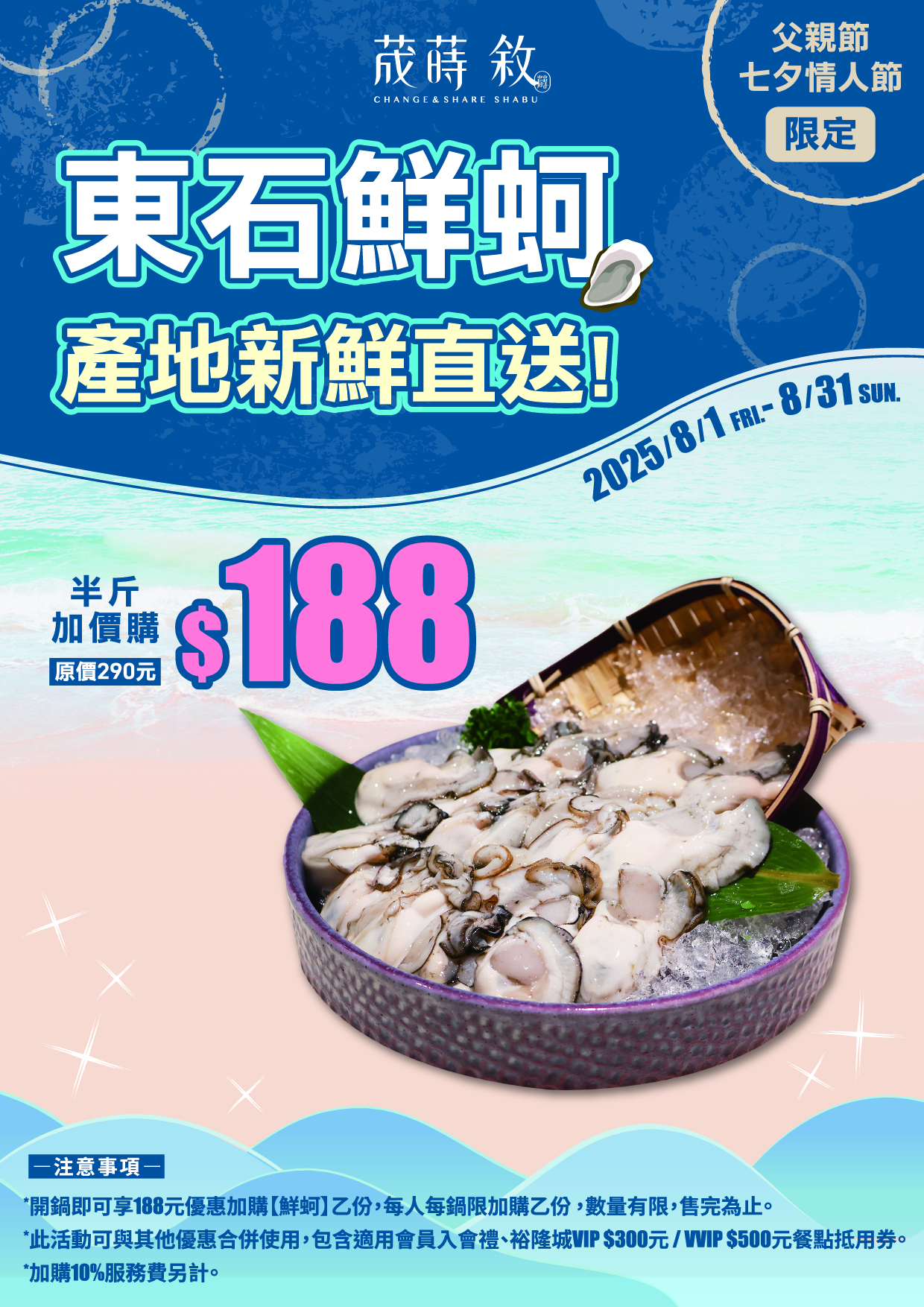 2025/8/1-8/31,只要開鍋即可享188元優惠加購「東石鮮蚵」,半斤大份量幫你進補一下