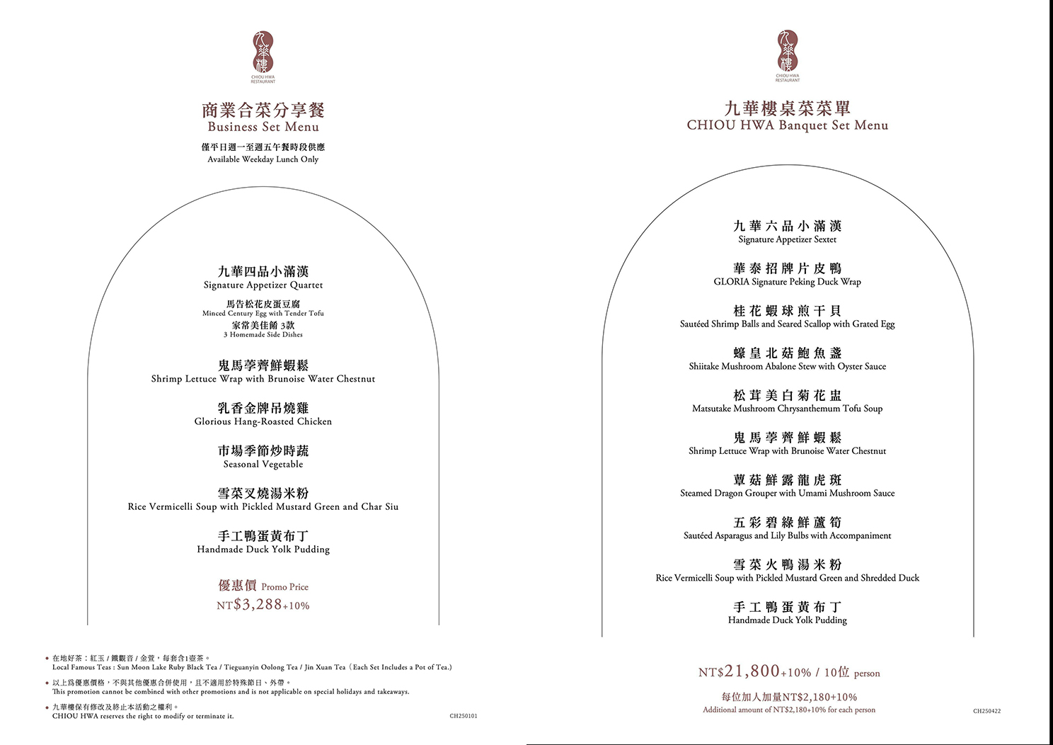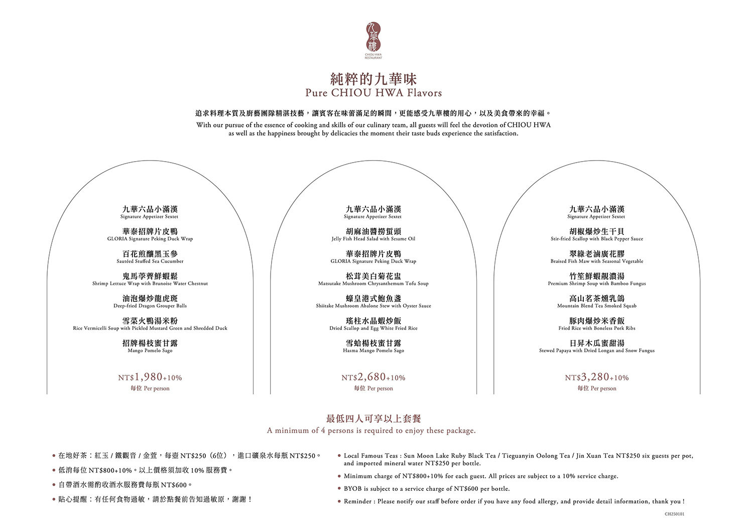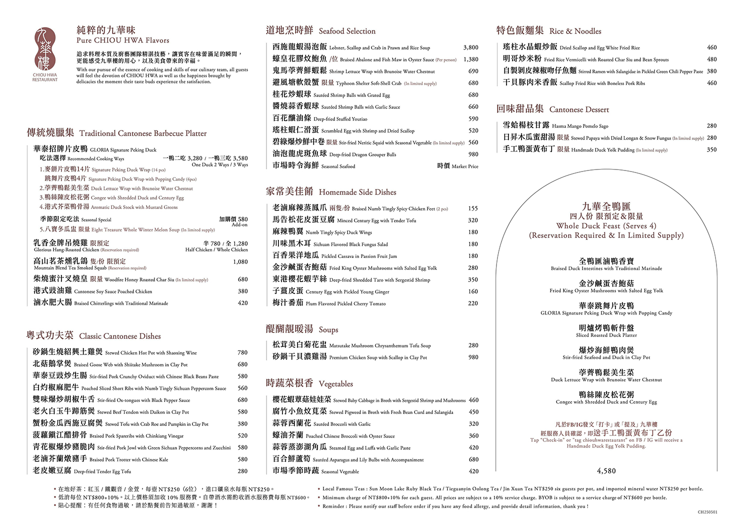 《九華樓朝富店》菜單如下,menu價格需加收10%服務費,低消每人800元+10%