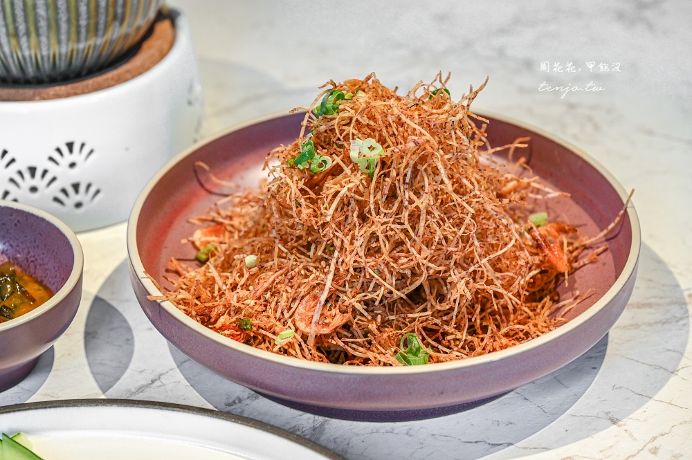 以手工切絲的大甲芋頭為基底油炸,加入東港櫻花蝦、自製九味鹽拌炒