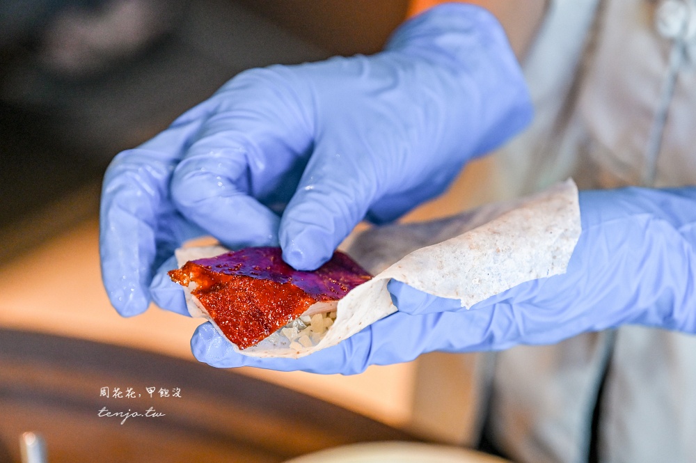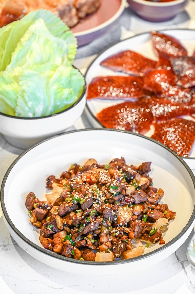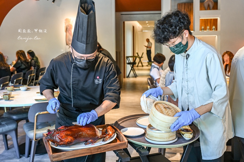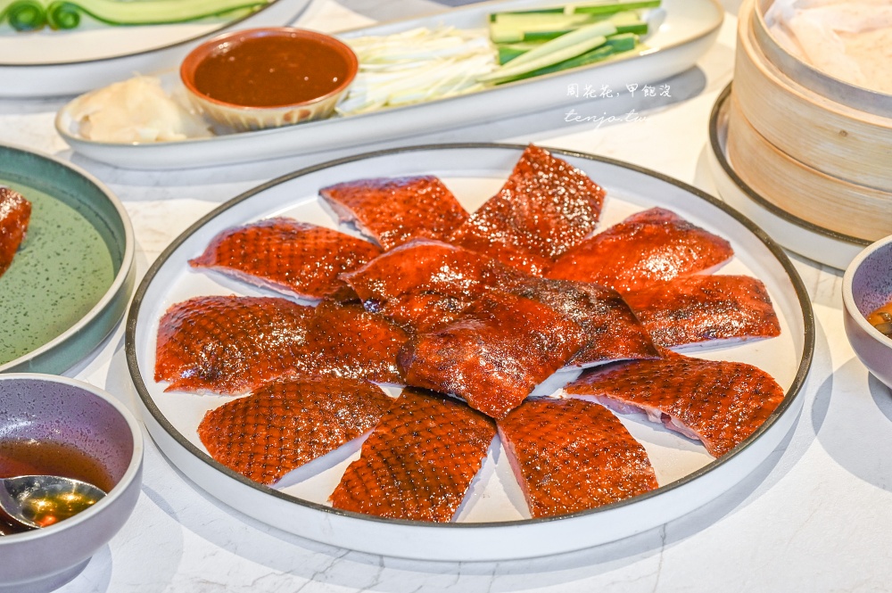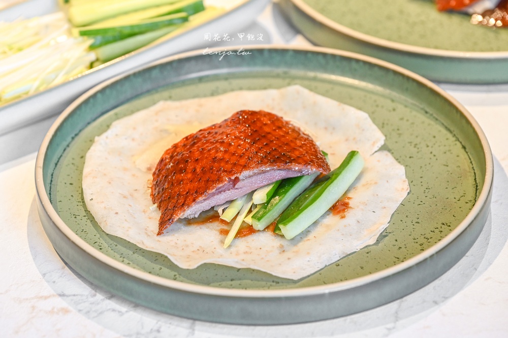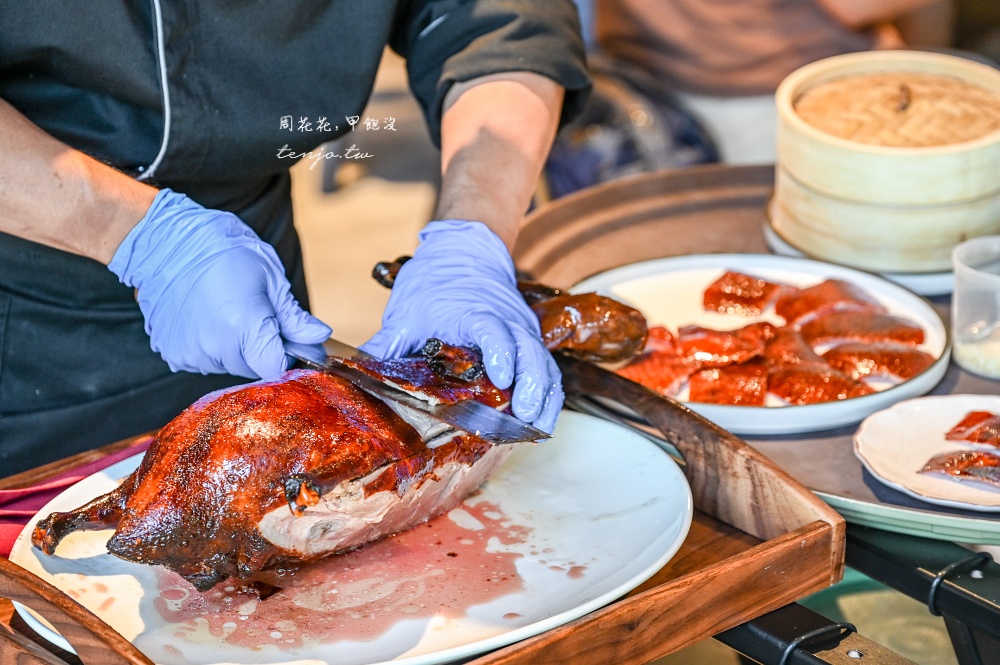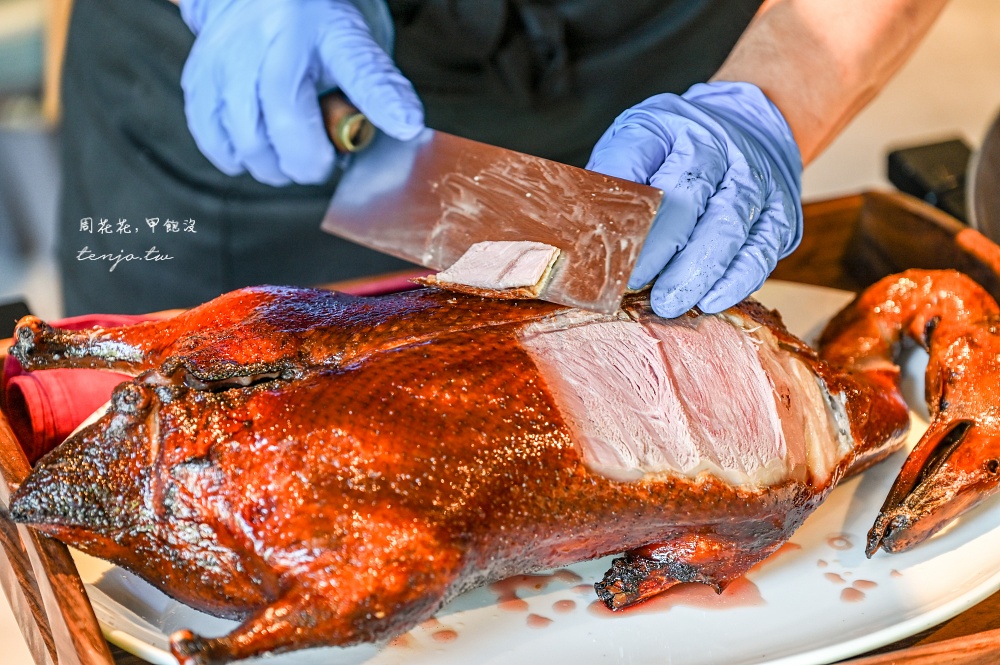 選用飼養75天、重達3.5公斤的北京種宜蘭鴨,經明爐烘烤後、再淋熱油上色,接著將餐車推至桌邊進行片鴨秀,也是品嚐烤鴨時的一大享受