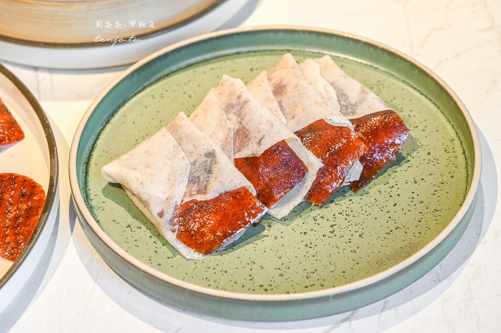 帶皮烤鴨呈現外酥內嫩的極品口感,不帶一絲多餘油感,能完全品嚐到好鴨肉的鮮甜感,交織著鴨皮討喜的油香
