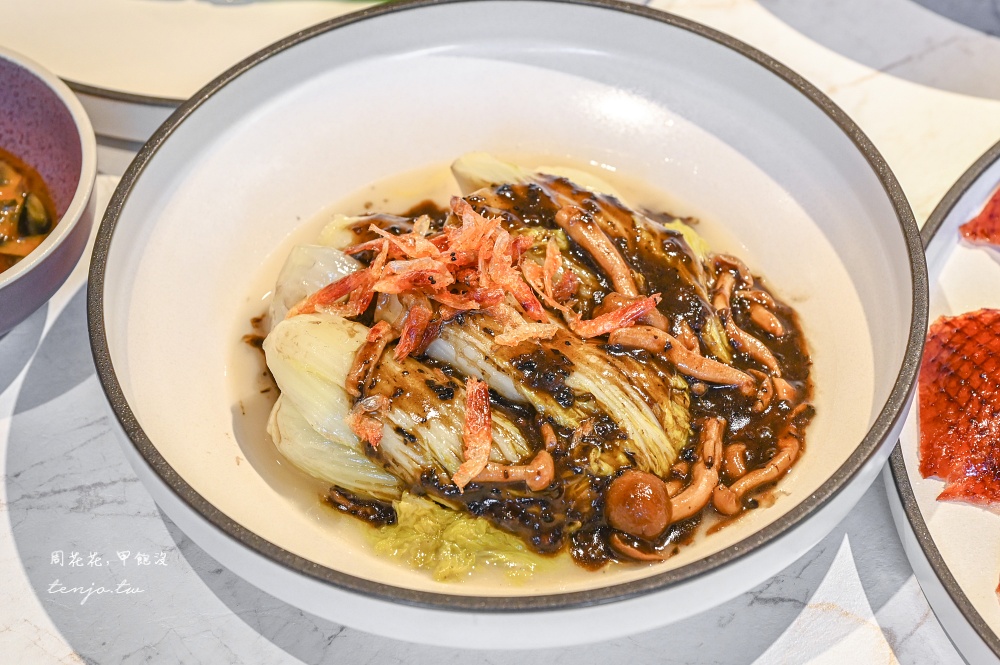 娃娃菜汆燙到恰到好處的熟度,仍帶有一點爽脆口感,與櫻花蝦、蕈菇醬的組合實在絕配,完全能吃出主廚食材組搭上的功力,每道菜都是滿滿的層次堆疊