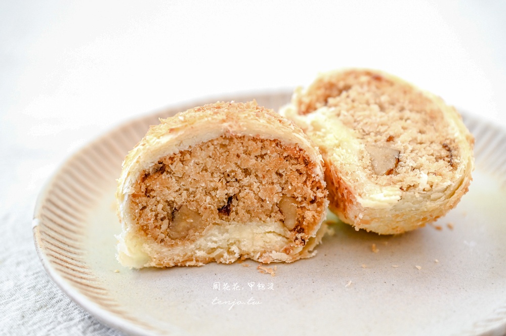 內餡包入滿滿綠豆皇,並以蘭姆酒漬葡萄乾搭配酥烤核桃增添風味與口感;外層再裹上清新椰子粉,一口咬下就能感受到濃郁椰香,是喜歡吃椰子的人,不能錯過的極品糕餅