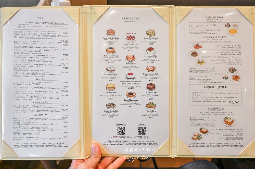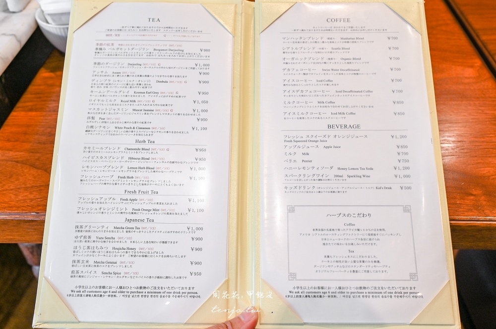 《HARBS 榮本店》菜單如下,內用低消每人一杯飲料