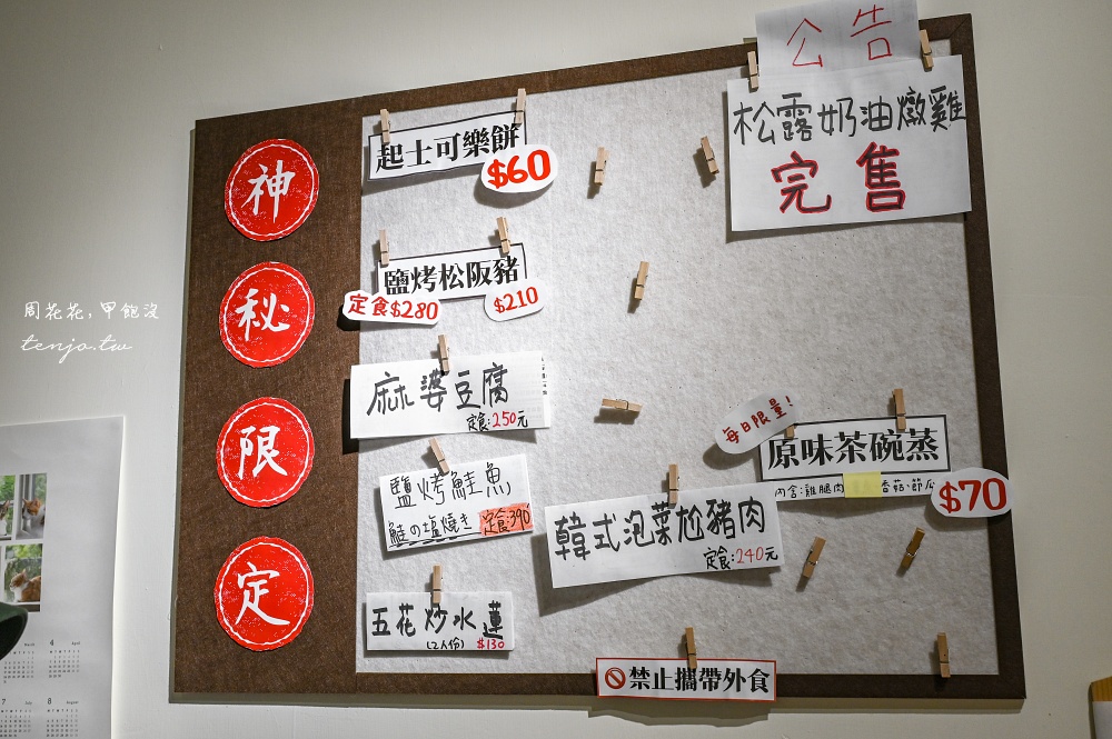 擁有多種定食料理,搭配開胃小菜、涼拌小菜,櫃檯前板子上還有幾種隱藏版料理,增加了選擇的變化性