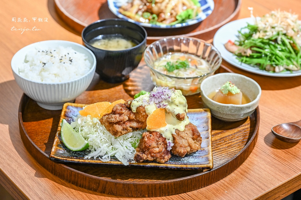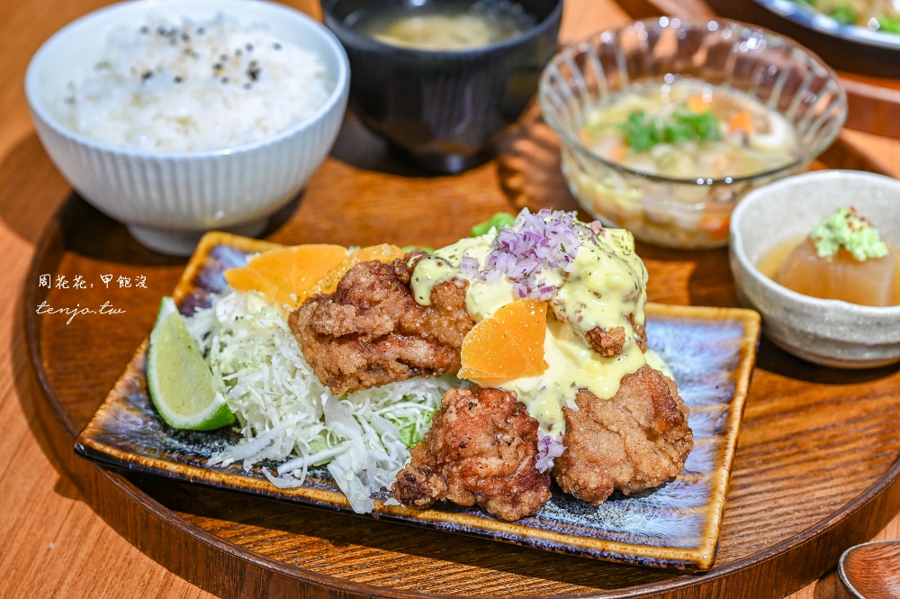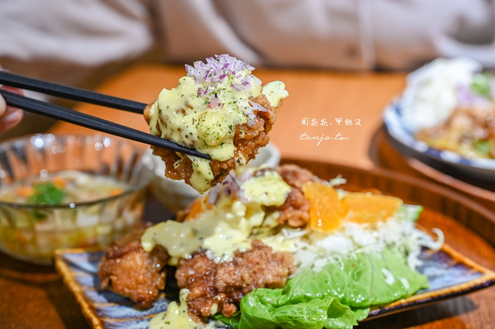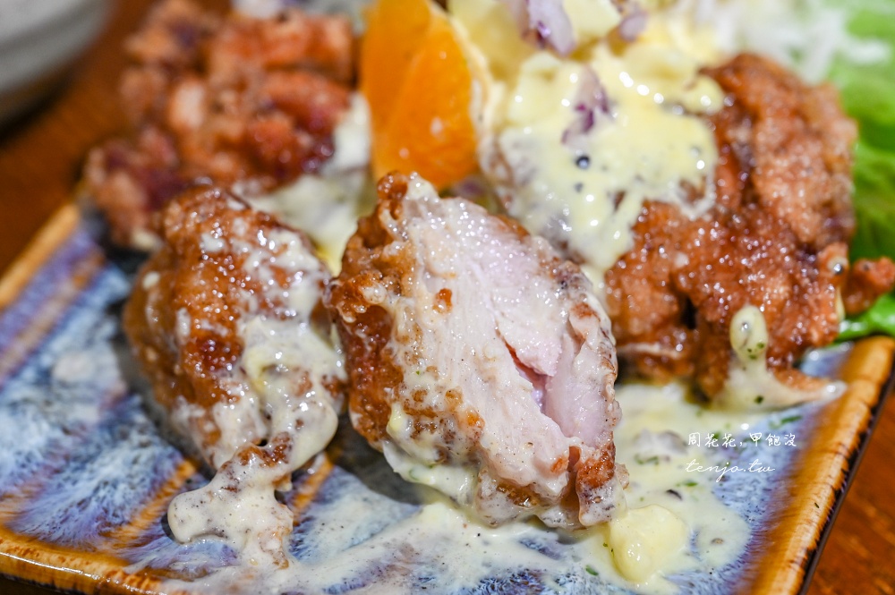 日式炸雞以自家醃製雞肉裹粉油炸,搭配上同樣是店家自製的塔塔醬