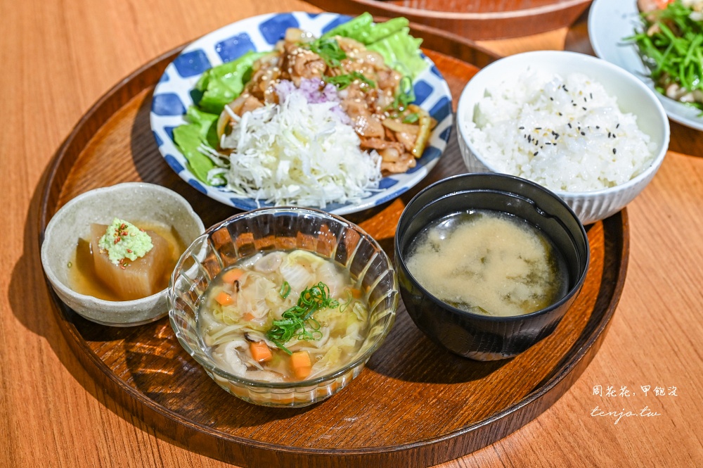 定食包含兩道小菜、白飯、湯品,白飯跟味噌湯可以免費續加一次