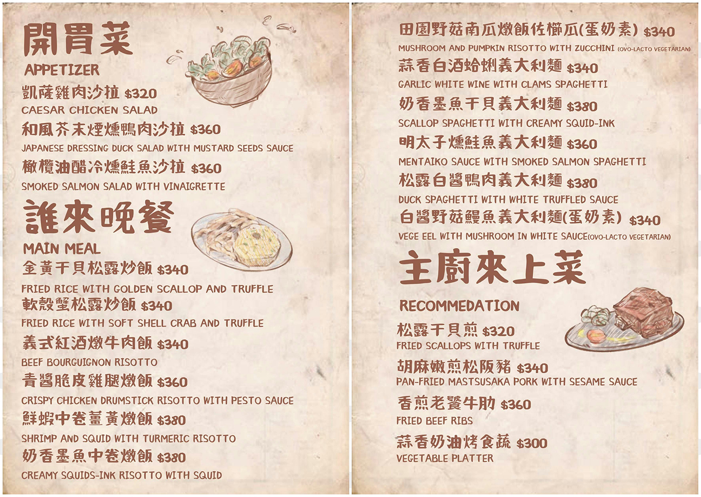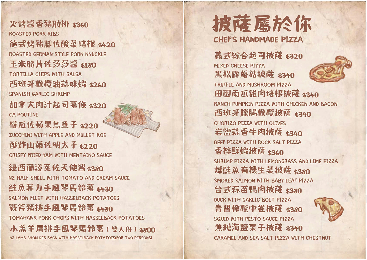餐點類有披薩pizza、開胃菜沙拉、炒飯、燉飯、義大利麵、排餐、披薩、炸物、宵夜小點,菜色選擇非常多元,而且份量都很實在,對應價格算是相當平價
