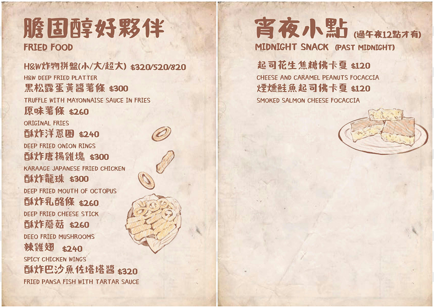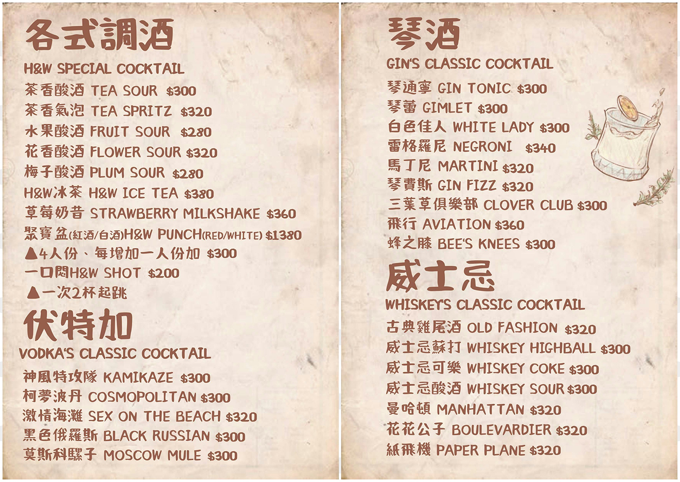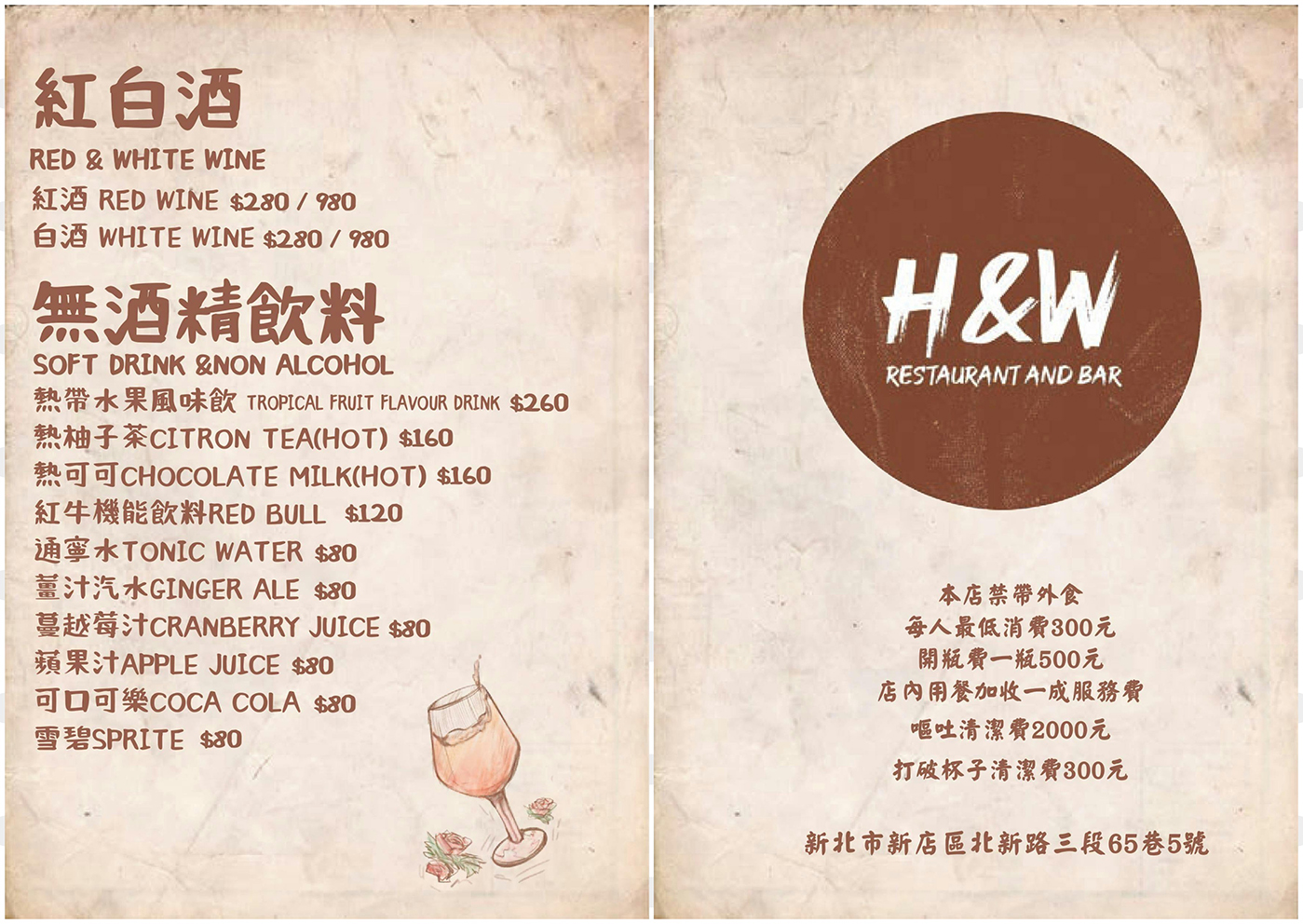 《H&W Restaurant and Bar》菜單如下,menu價格需加收一成服務費,每人低消300元