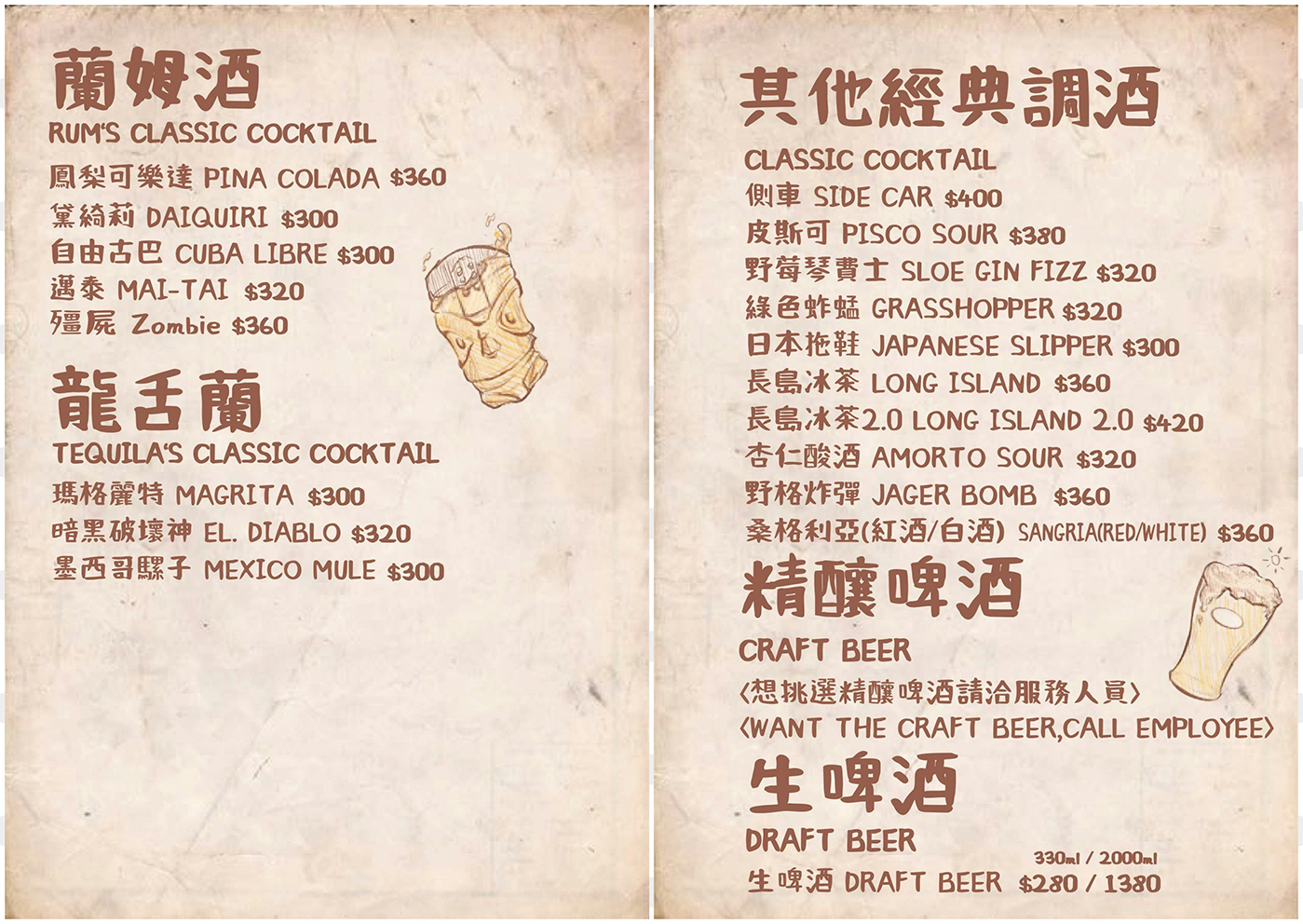 特色調酒、經典調酒等各式調酒,搭配精釀啤酒、生啤酒、紅酒、白酒,不喝酒的人也有不少無酒精飲料可點