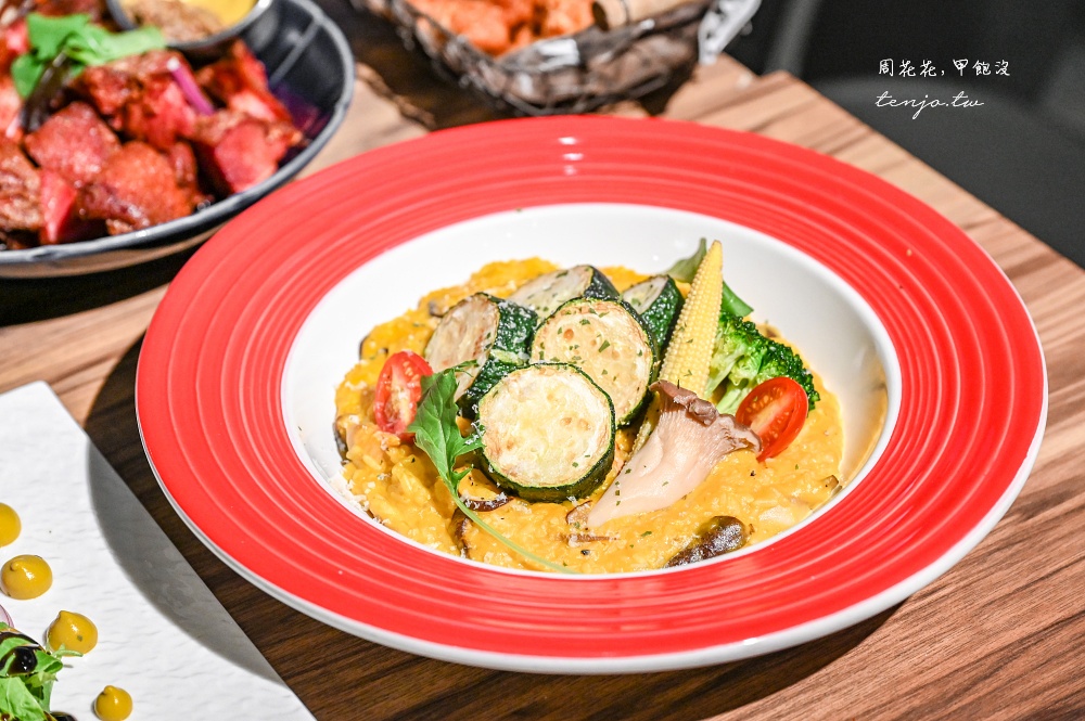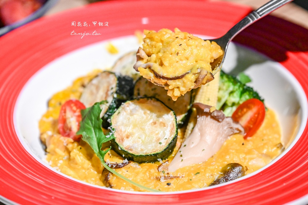 厚切櫛瓜甜脆多汁,豐富的蔬菜品項讓燉飯吃來充滿變化性,即使是蔬食者也能大快朵頤的美食