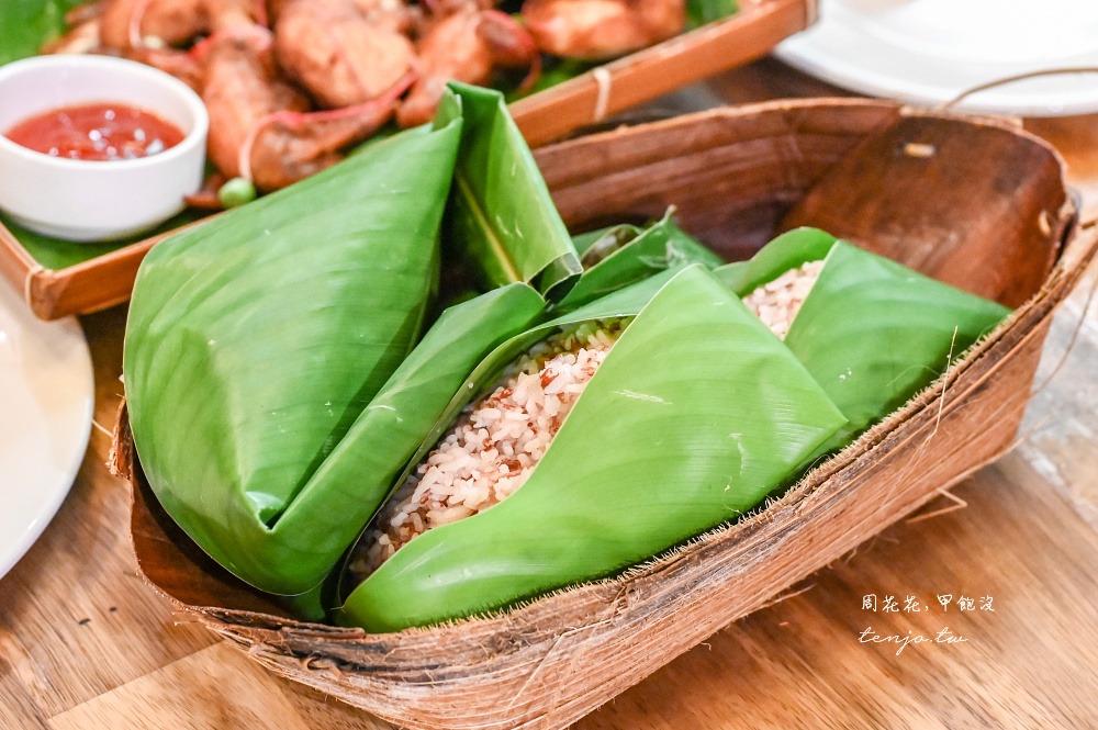 米飯用月桃葉包裹,品嚐起來氛圍感十足,概念和台灣原住民的獵人飯包是一樣的