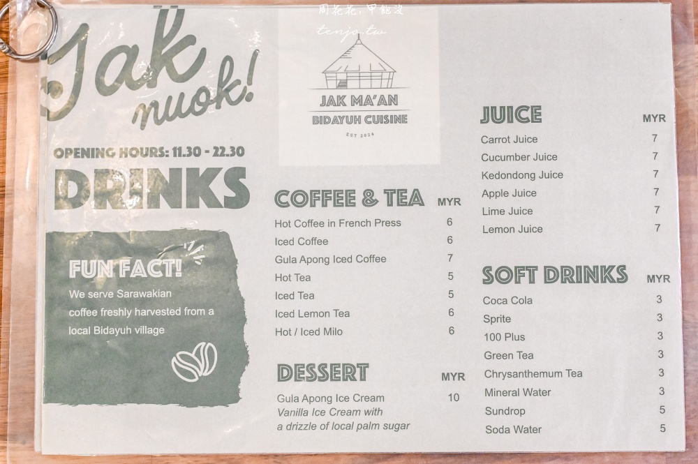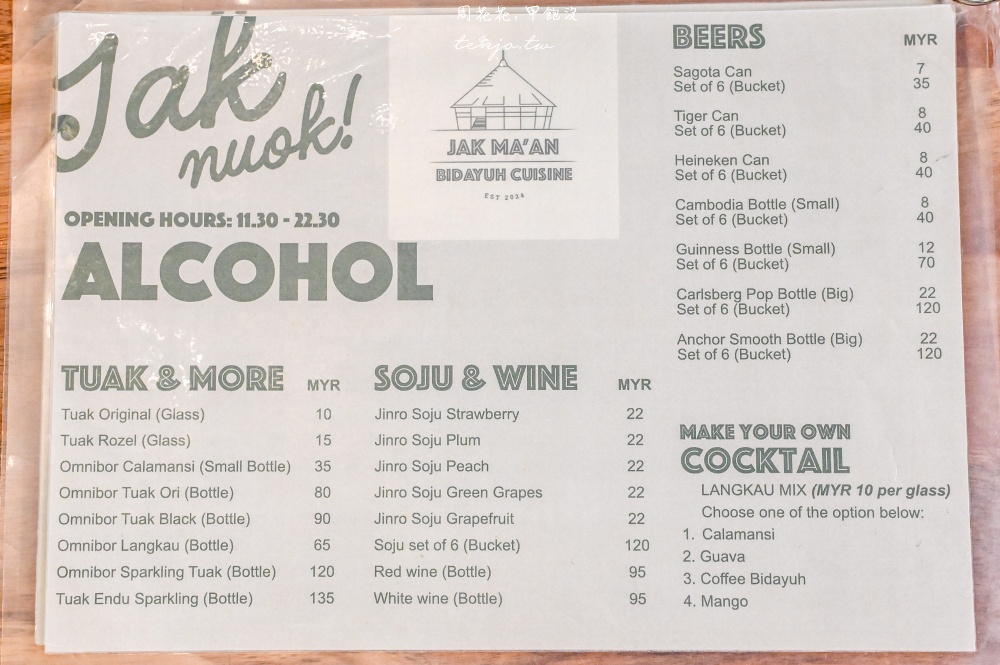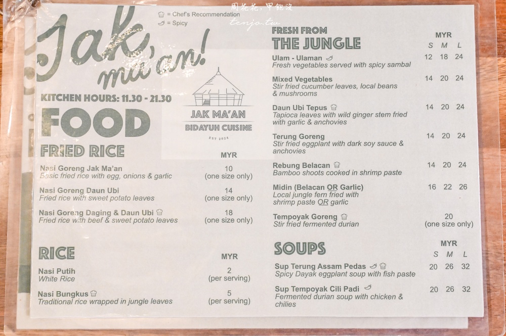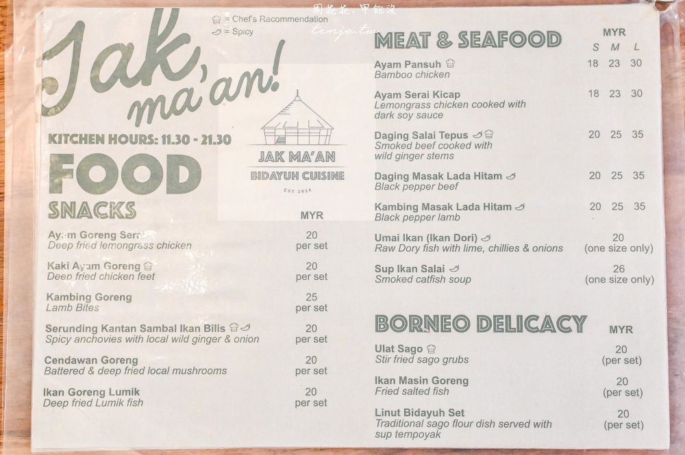 《Jak Ma’An》菜單如下,主打砂拉越原住民料理