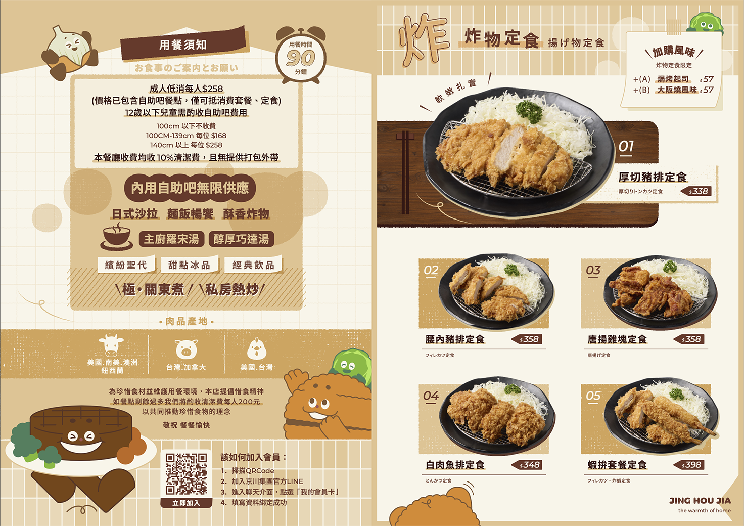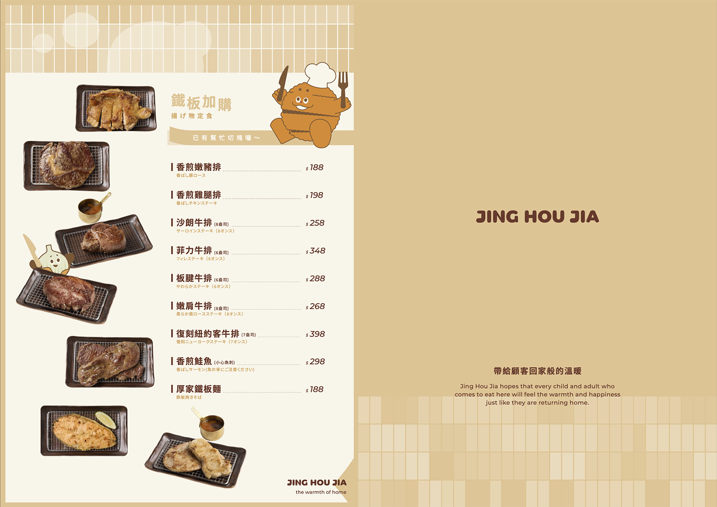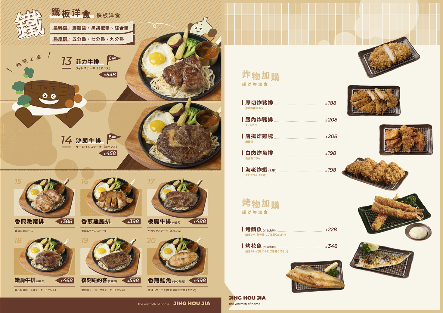 《京厚家》菜單有鐵板洋食、炸物定食等多種選擇,牛排、炸豬排、唐揚雞等全部吃得到
