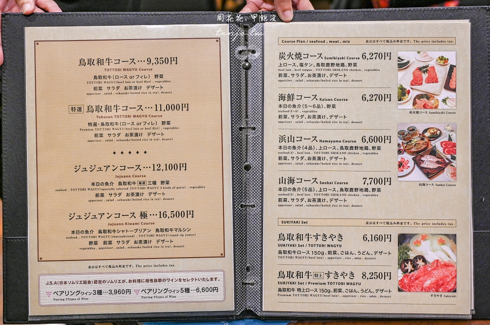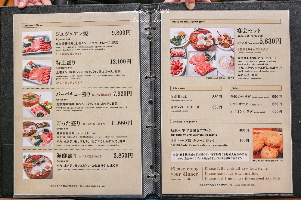 《炭火燒jujuan》菜單菜色選擇多元,無論想吃鳥取和牛、鳥取海鮮等各式鳥取縣產食材都能吃到