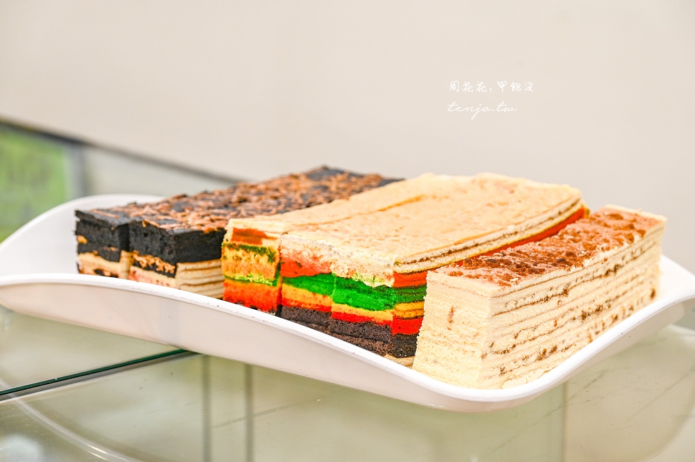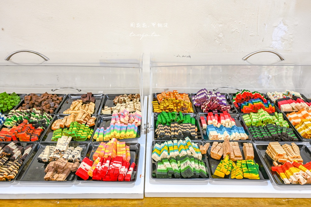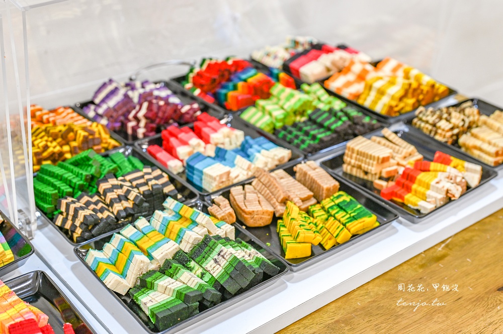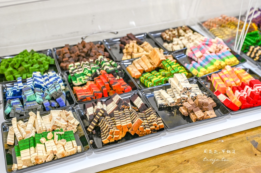 這家店的試吃給得超級大方,近50種口味的「砂拉越千層糕」隨你自由夾取,要全部吃一輪也可以,不怕選不到自己喜歡的口味