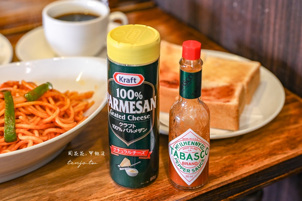 拿波里麵必備的起司粉、TABASCO會另外提供,讓你依照喜好自由添加
