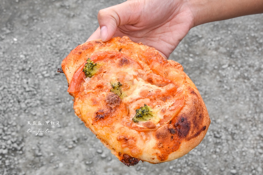 以青醬為基底,加上番茄、綠花椰菜、起司,麵包香氣十足、在口中越嚼越香,與每種食材的搭配相當完美,三兩口就吃光光的喜歡