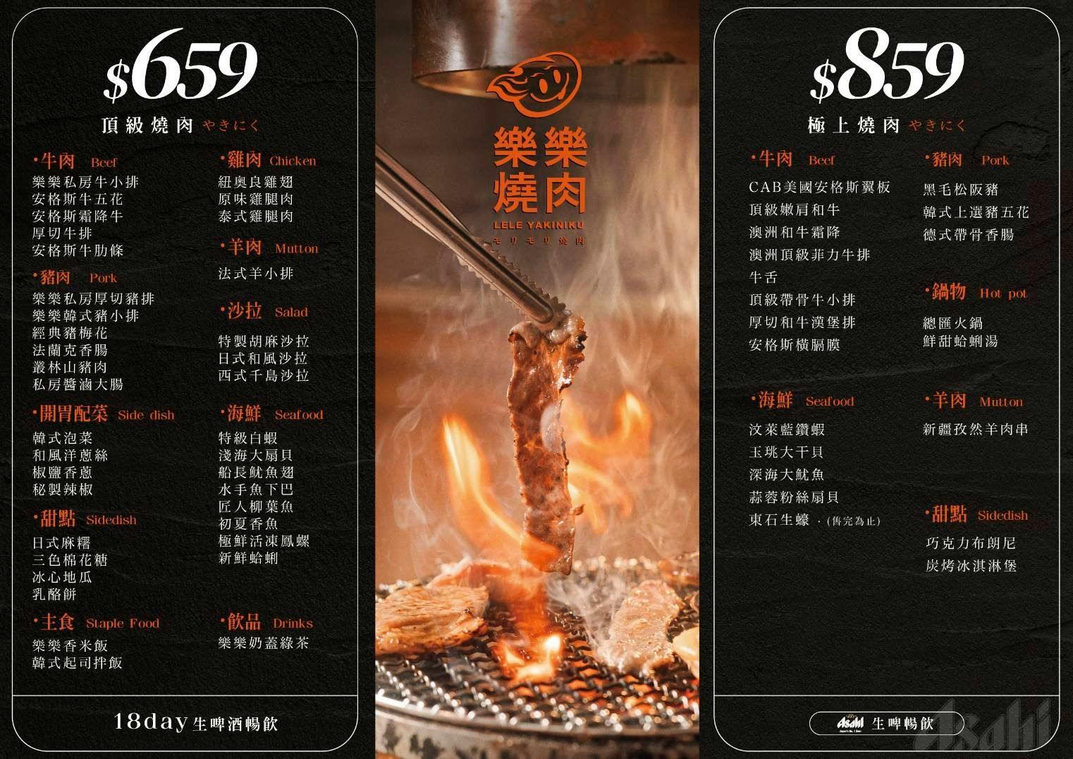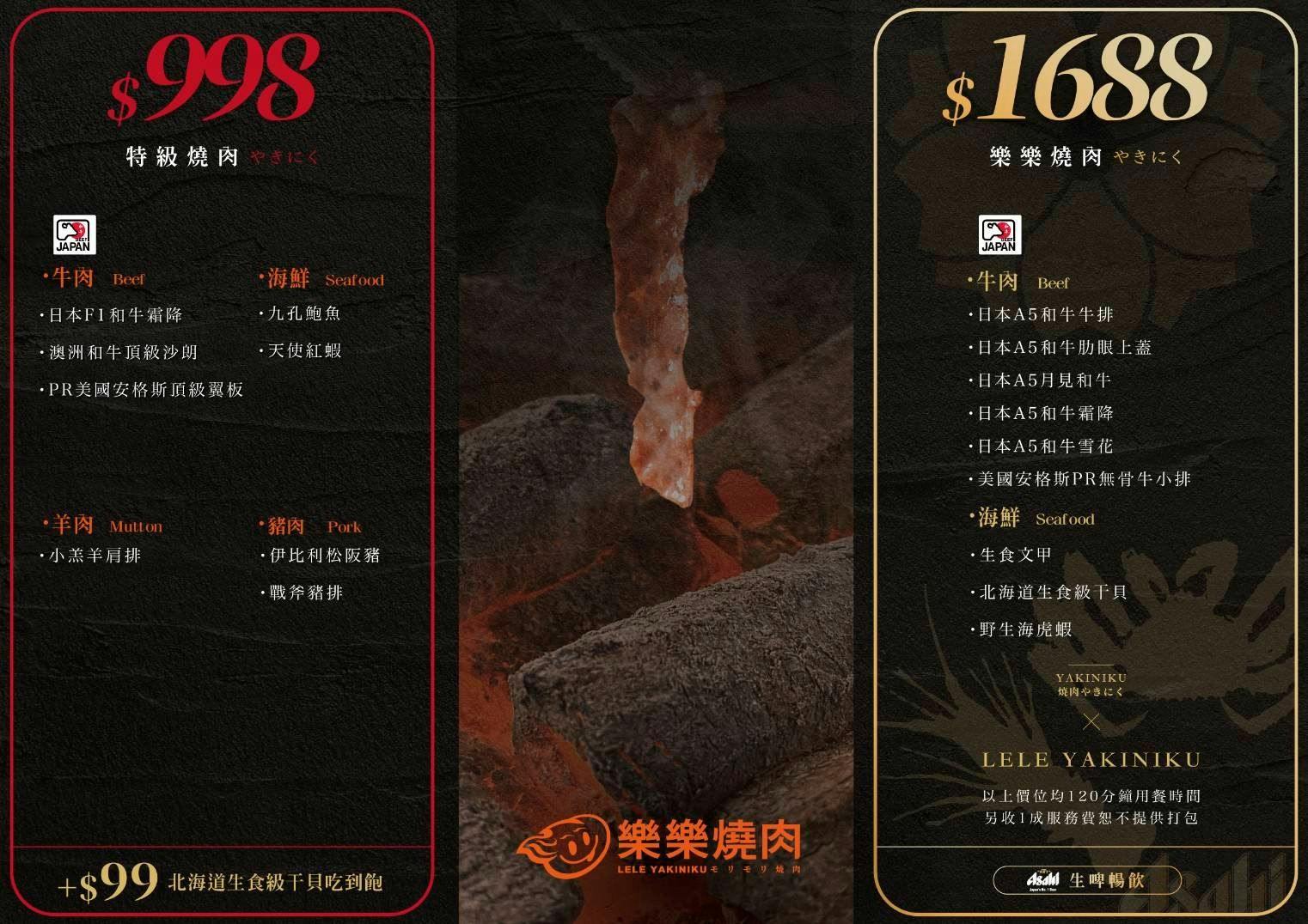《樂樂燒肉蘆洲店》菜單、吃到飽價位如下,共分成659元、859元、998元、1,688元四種價位