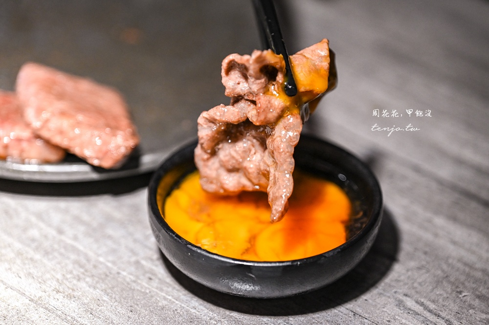 烤好的和牛肉片,豪邁沾上生蛋黃醬汁,一口吃下說多享受就有多享受啊