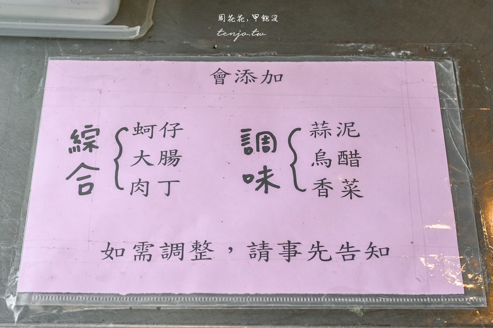 蚵仔的粉裹得不會太厚,仍能吃到蚵仔最原始的鮮甜,大腸滷得有入味,吃起來沒有內臟異味,肉丁的調味與口感都不錯,三種配料皆很夠水準