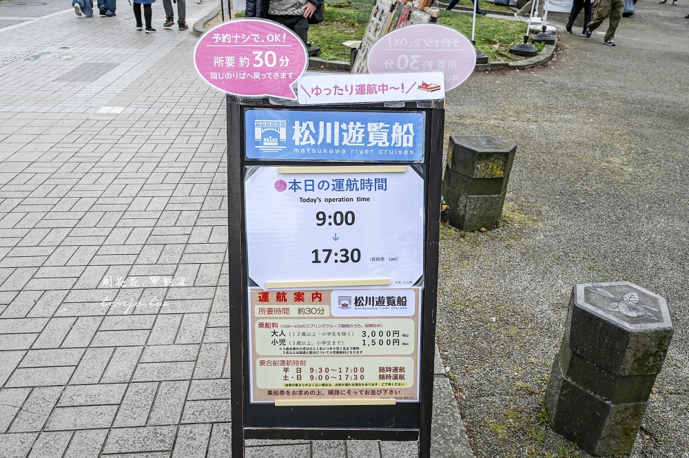 「松川遊覽船」費用為大人3,000円、兒童1,500円,航程約30分鐘,營業時間為平日9:30-17:00、週末9:00-17:30