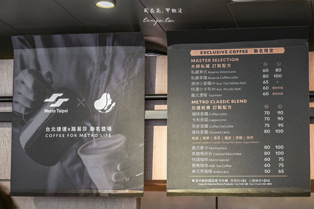 《路易莎大安森林公園店》菜單除了可以喝到路易莎咖啡外,還有與台北捷運聯名的限定配方豆
