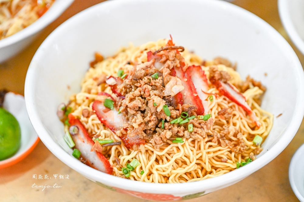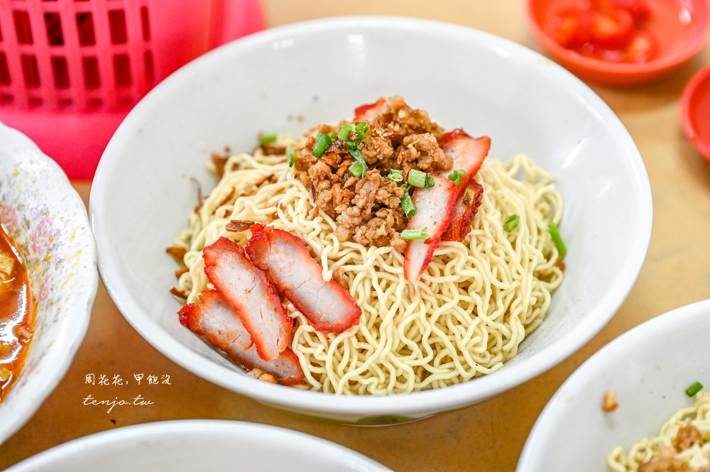 乾麵上頭擺上豬肉末、叉燒、油蔥、蔥花,吃之前記得要均勻攪拌,讓醬汁和麵條充分混合後,吃起來的味道才是最完整的