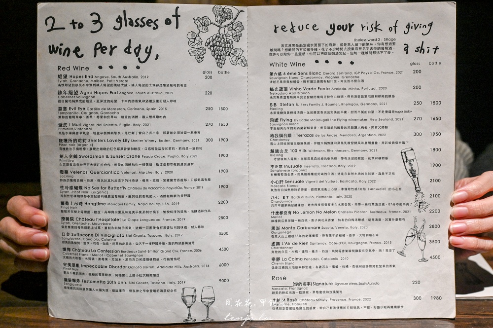 《厭世會社》酒單上有著許多單杯紅酒、白酒可點,平價價格讓人享受美酒無負擔