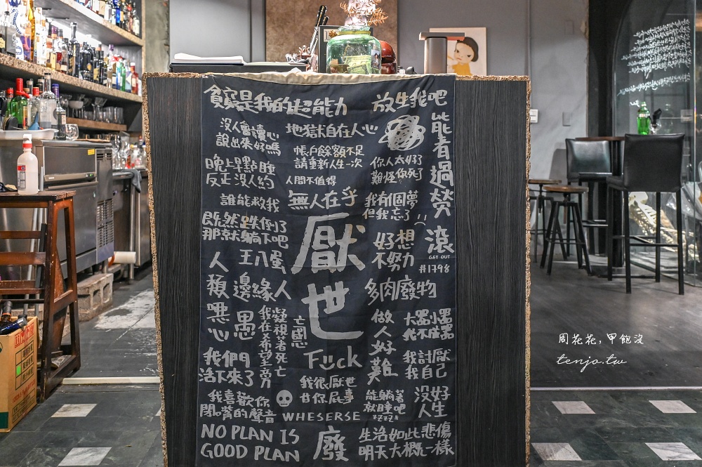《厭世會社》菜單菜色、酒飲選擇多元,無低消、不限時、不收服務費,還可以訂位、帶外食