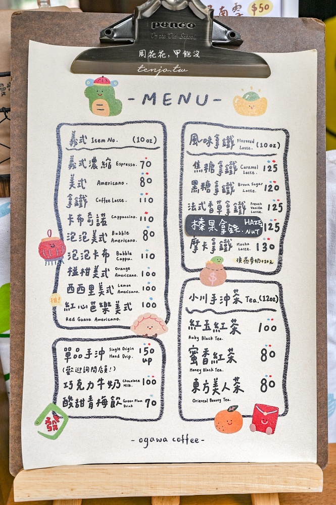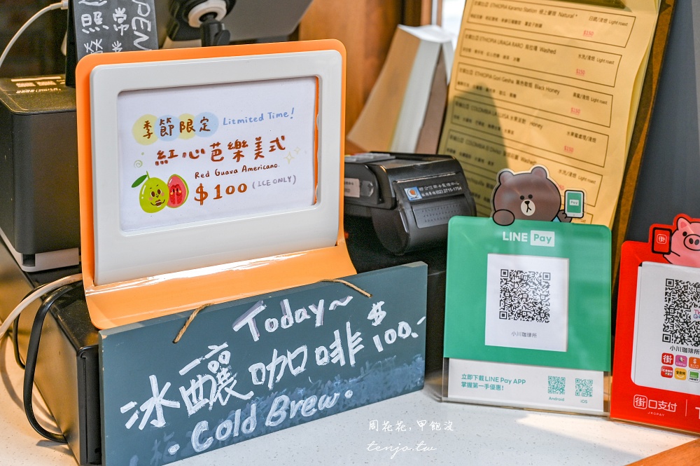 《小川珈琲所》菜單咖啡價位便宜,推薦好喝又有特色的紅心芭樂咖啡,還有布丁、費南雪等甜點可吃
