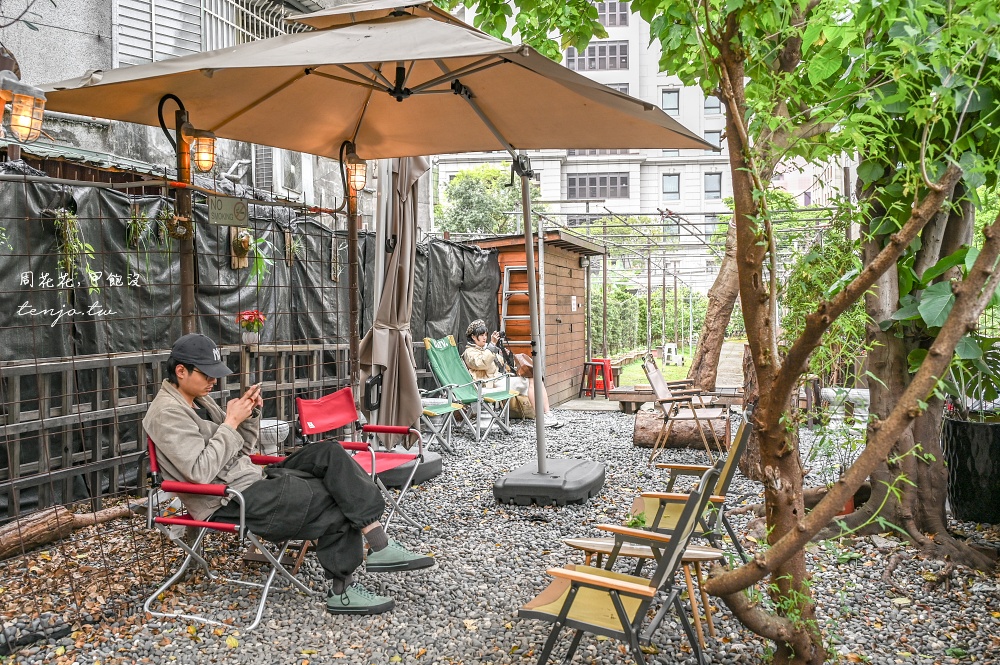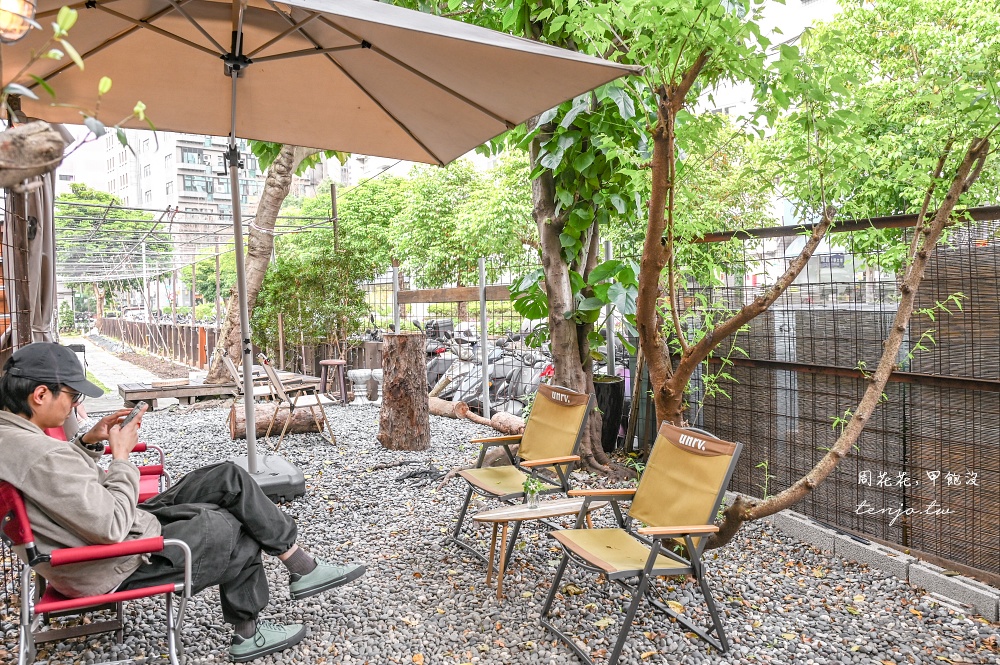 後方空地有設置座位區,大樹下、石子地、露營椅的環境舒適愜意