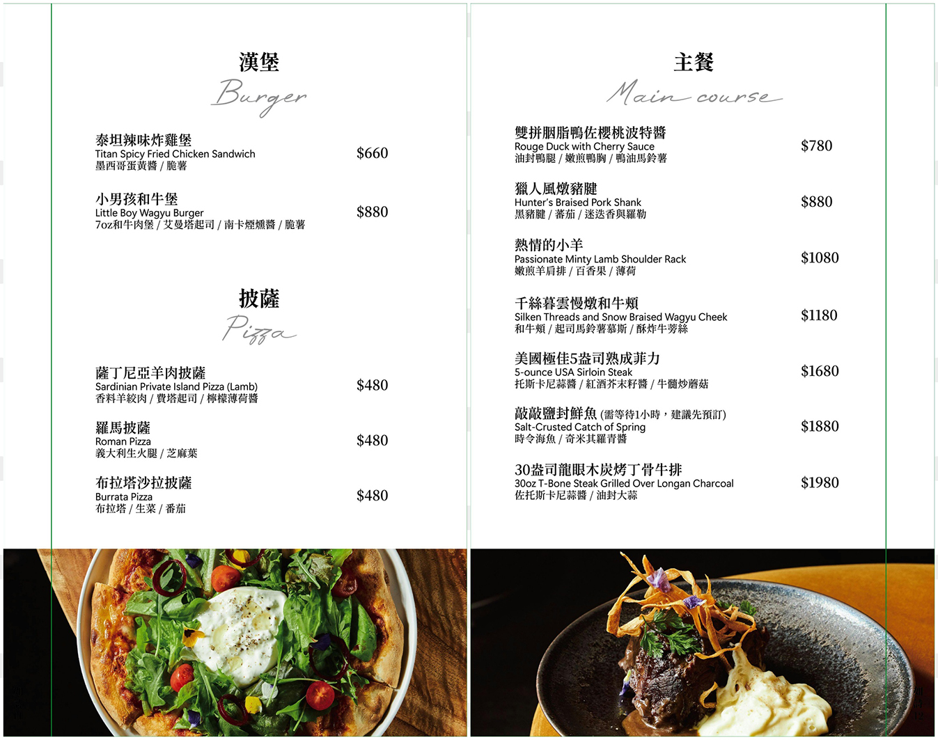 單點類則有生蠔、開胃小點、前菜、蔬菜、湯品、麵類、燉飯、漢堡、披薩、主餐、甜點