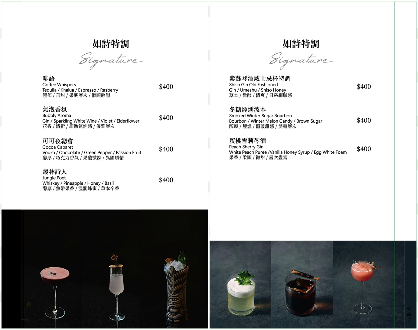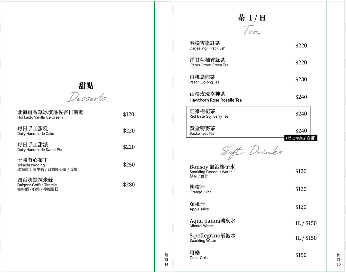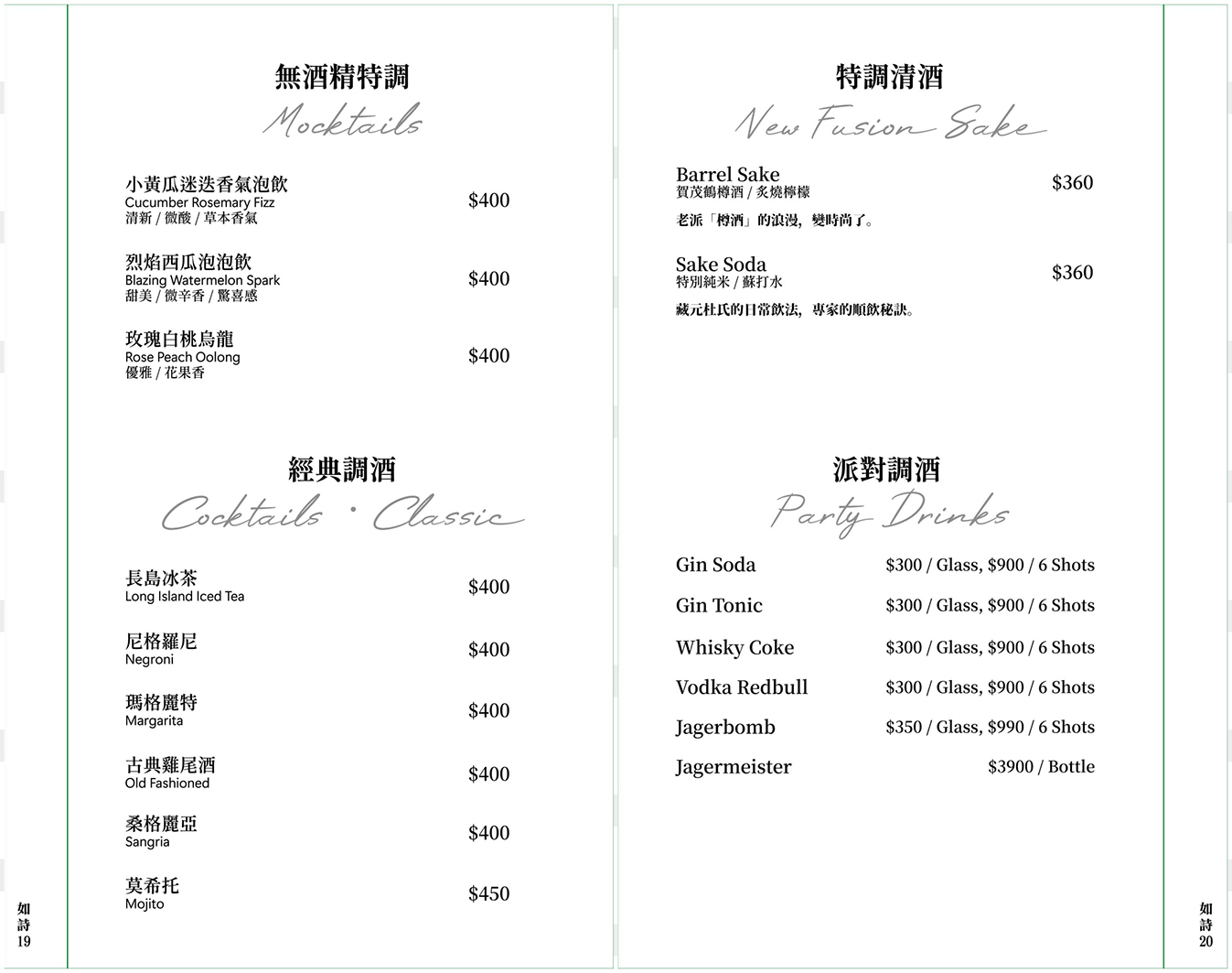 《Poetry 如詩》菜單如下,menu價格需加收一成服務費