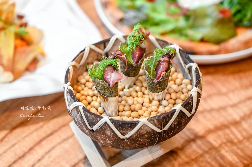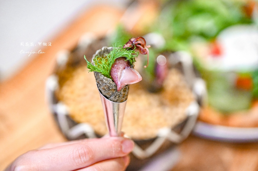 「海之捲」是以海苔甜筒包裹螢烏賊,搭配辛香芥菜醬、芥末,濃縮大海精華的一口開胃小點,層次相當豐富,第一道菜就讓我們無比驚艷