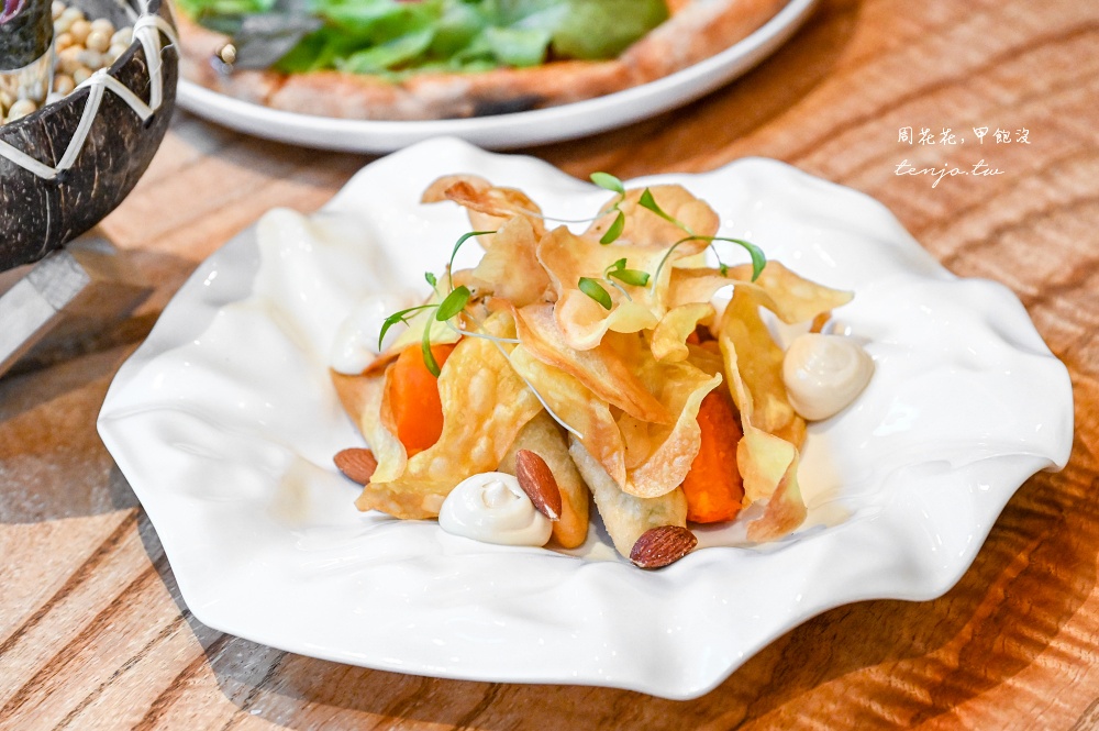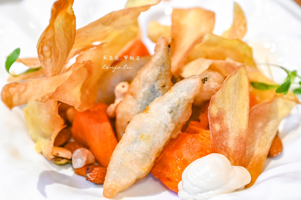 溫沙拉以烤南瓜、炸秋葵、梅粉地瓜脆片三者組合,並搭配綜合堅果做點綴