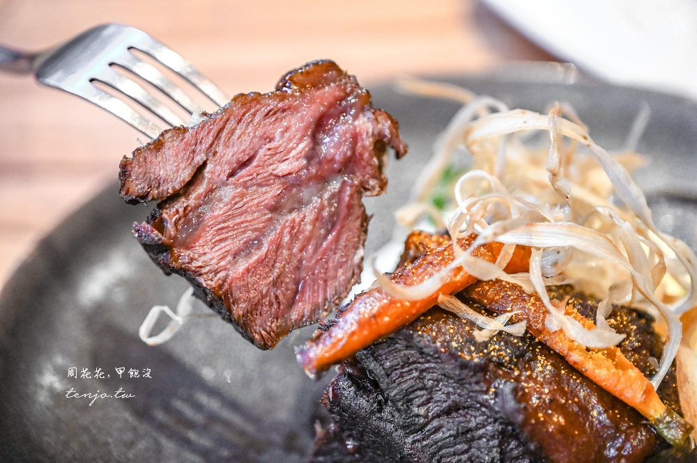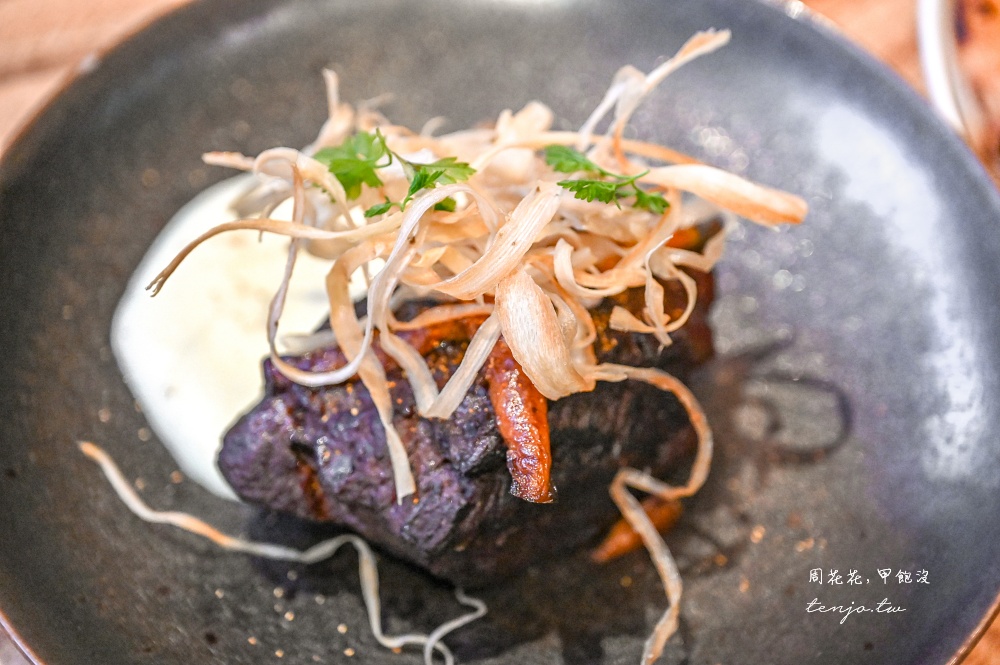 美國和牛頰有撒上煙燻鹽,直接單吃就很夠味,搭配起司馬鈴薯慕斯、酥炸牛蒡絲更是別有一番風味,這道真的超級強!