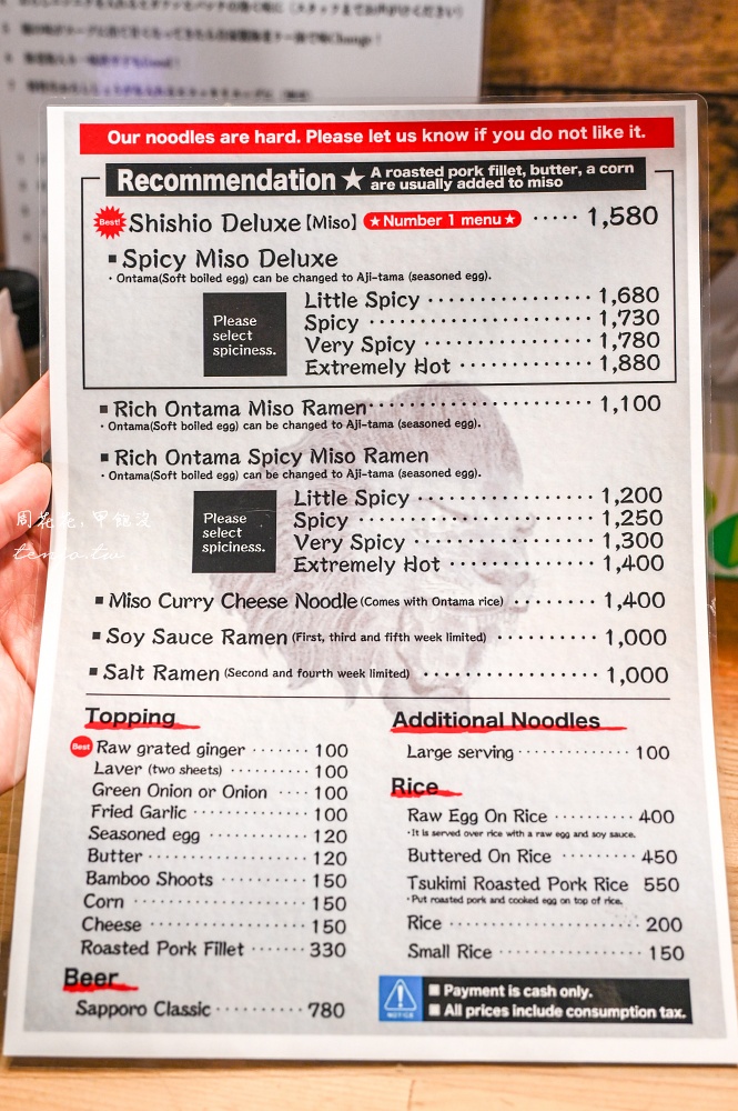看不懂日文的話也沒關係,店家有提供英文菜單,基本上就是味噌拉麵、辣味噌拉麵、醬油拉麵、塩味這幾種,價格則是稍稍偏貴