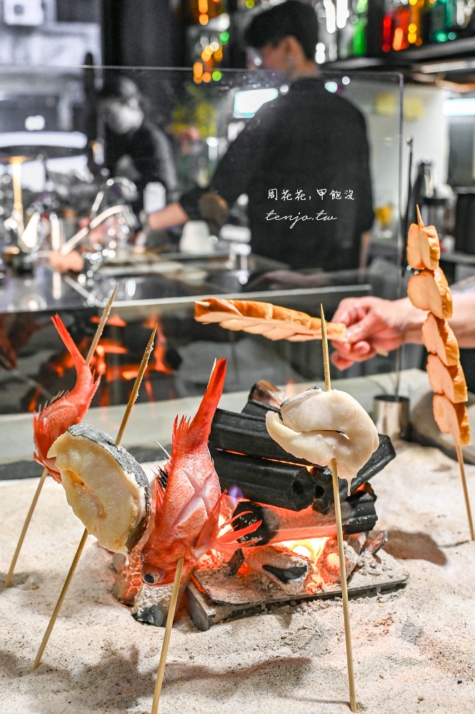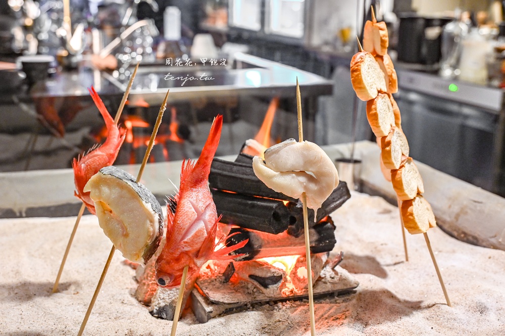 爐端燒烤爐直接展示在座位區旁,讓大家可以近距離欣賞餐點製作過程,這點在台灣也是相對少見,我印象中大多只有日本的餐廳才會這樣烤給大家看呀